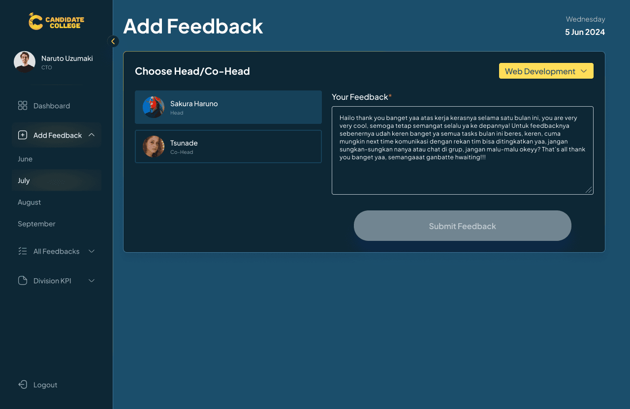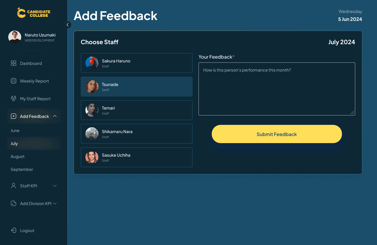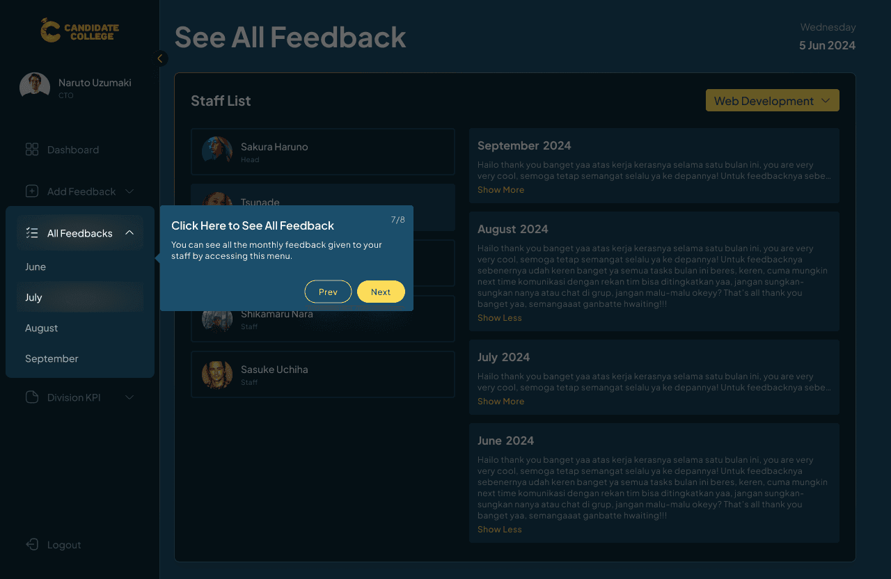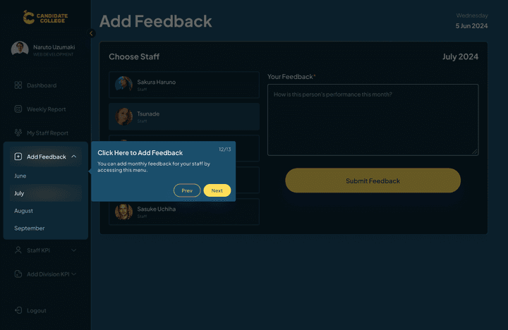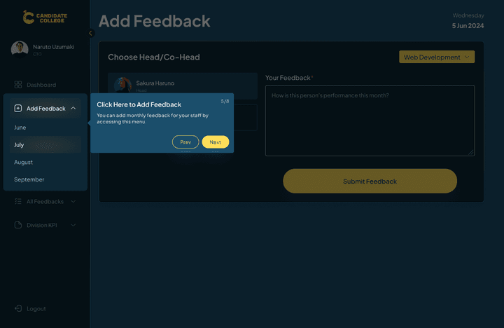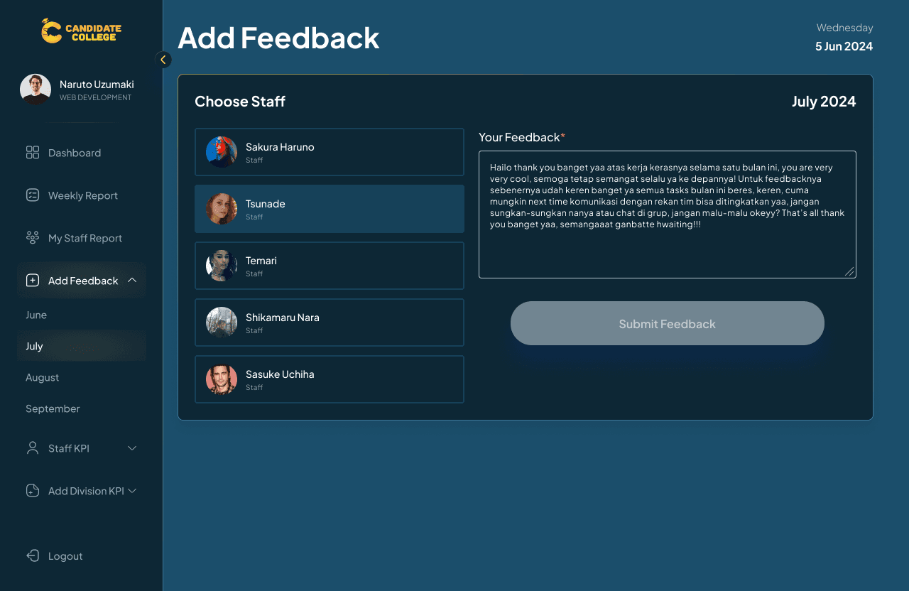 Aside from viewing the staff report, the head & co-head are also able to give each of their staff monthly feedback. This feature will only be active on a certain date of the month and not accessible at any other time. To enter this feature, users need to click on the dropdown on the sidebar and choose a month. This design decision is directly from the CTO themself even though I have provided them with another option which is to use a month dropdown on the main page, but they still prefer it to be on the sidebar.