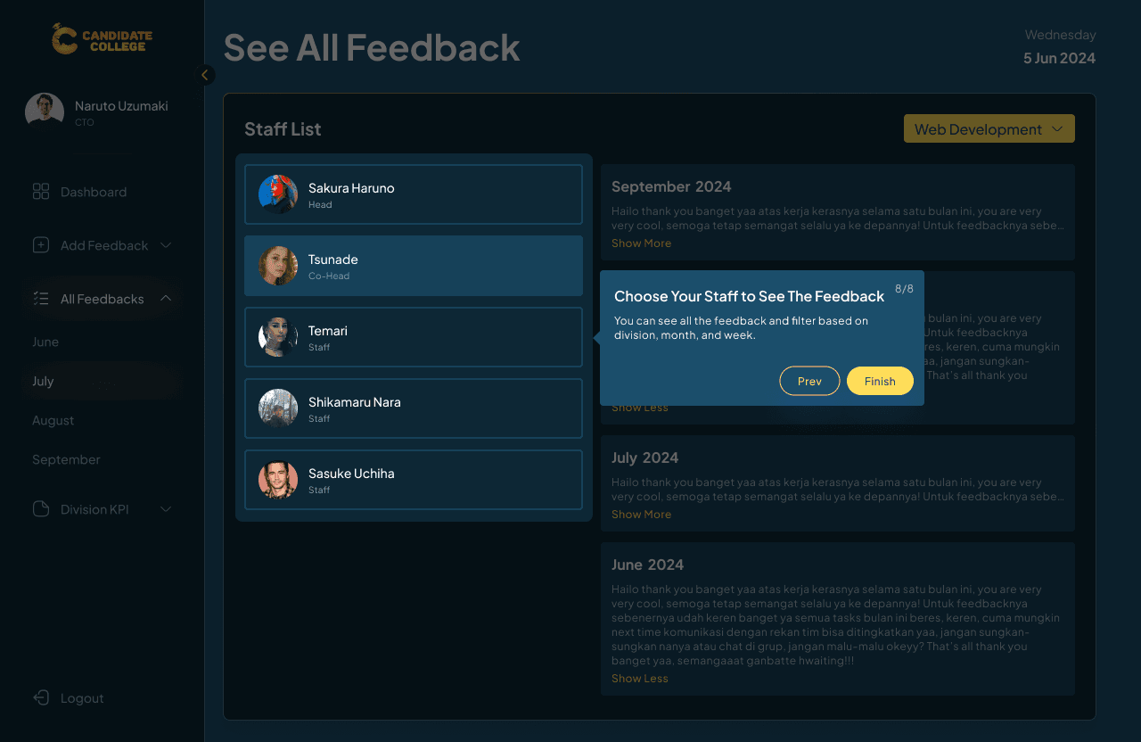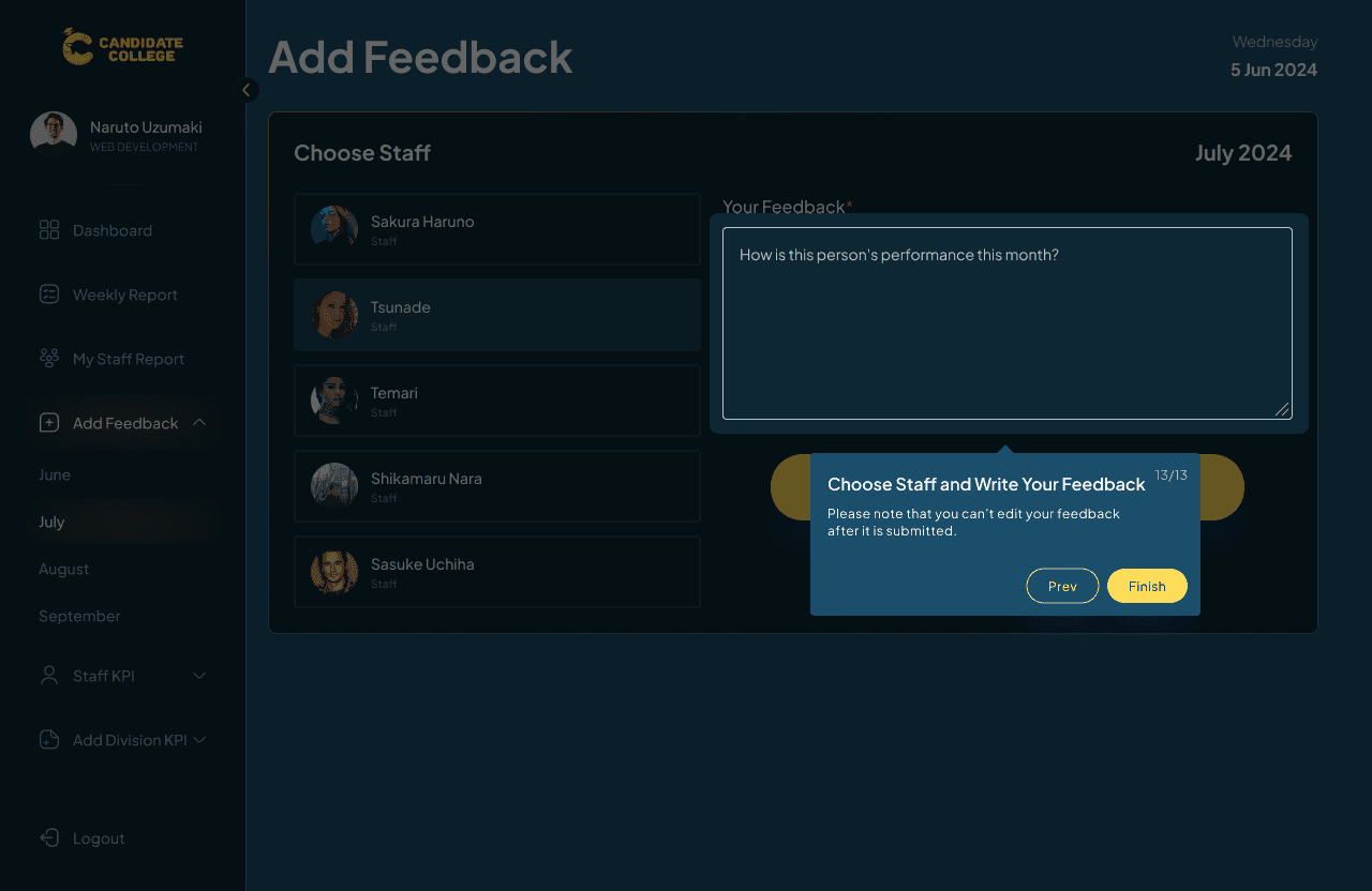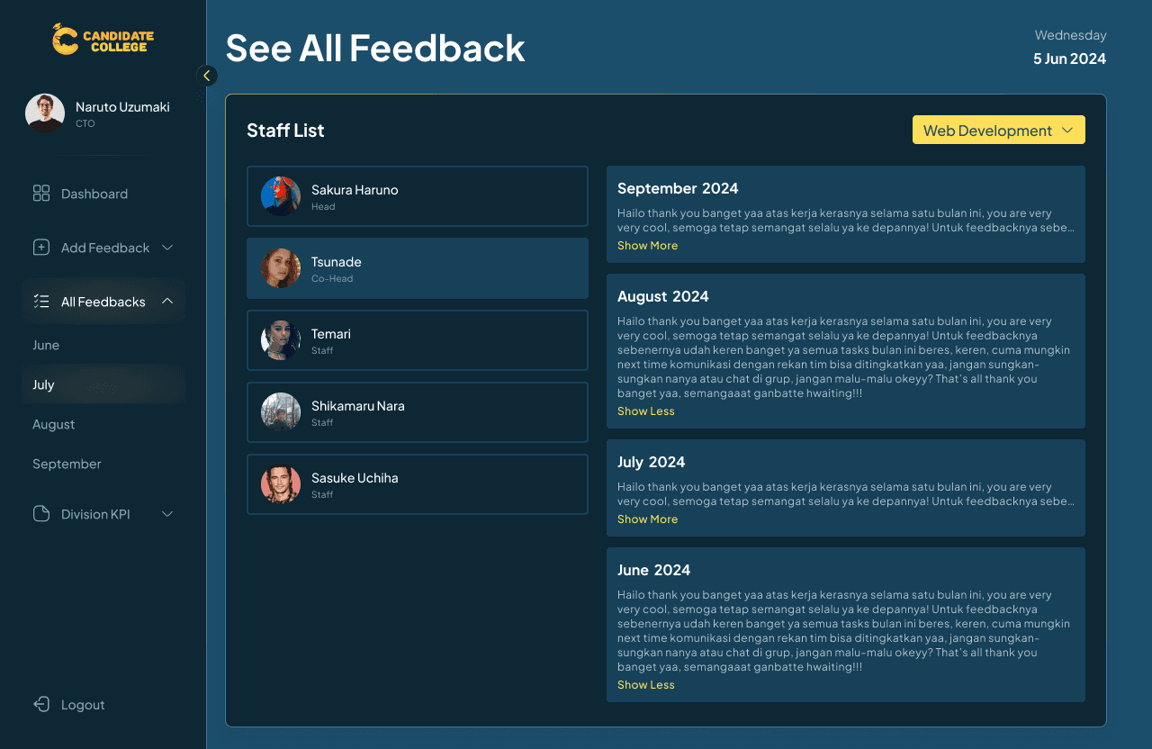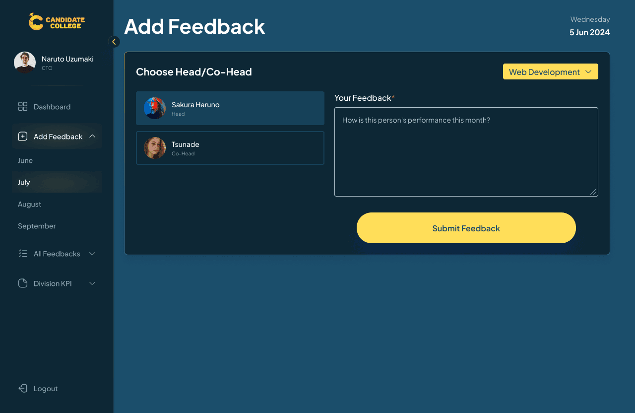 Aside from viewing the staff report, the head & co-head are also able to give each of their staff monthly feedback. This feature will only be active on a certain date of the month and not accessible at any other time. To enter this feature, users need to click on the dropdown on the sidebar and choose a month. This design decision is directly from the CTO themself even though I have provided them with another option which is to use a month dropdown on the main page, but they still prefer it to be on the sidebar.