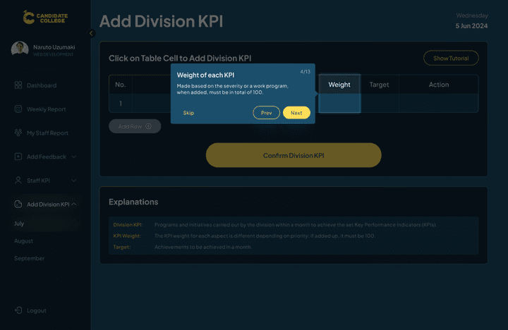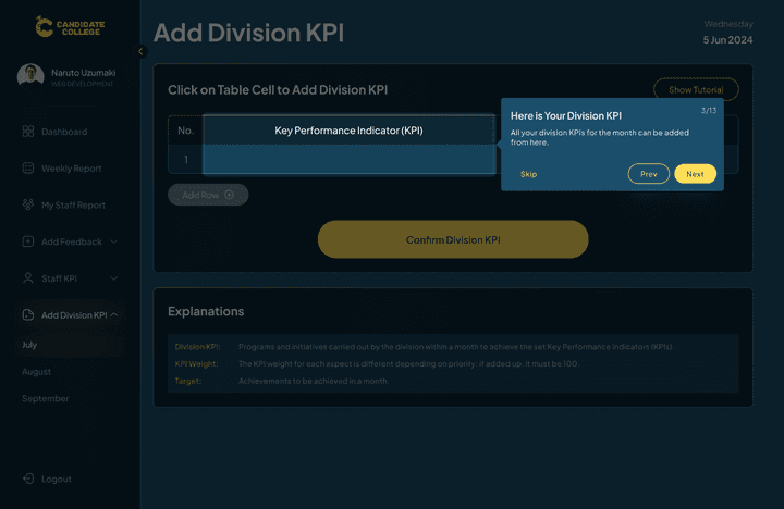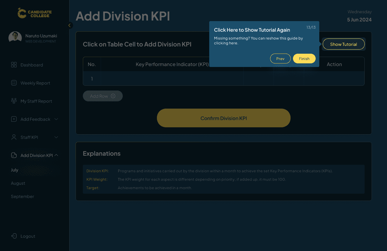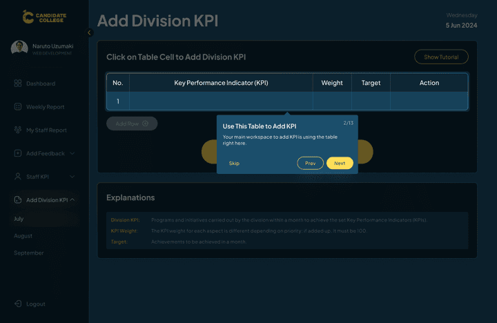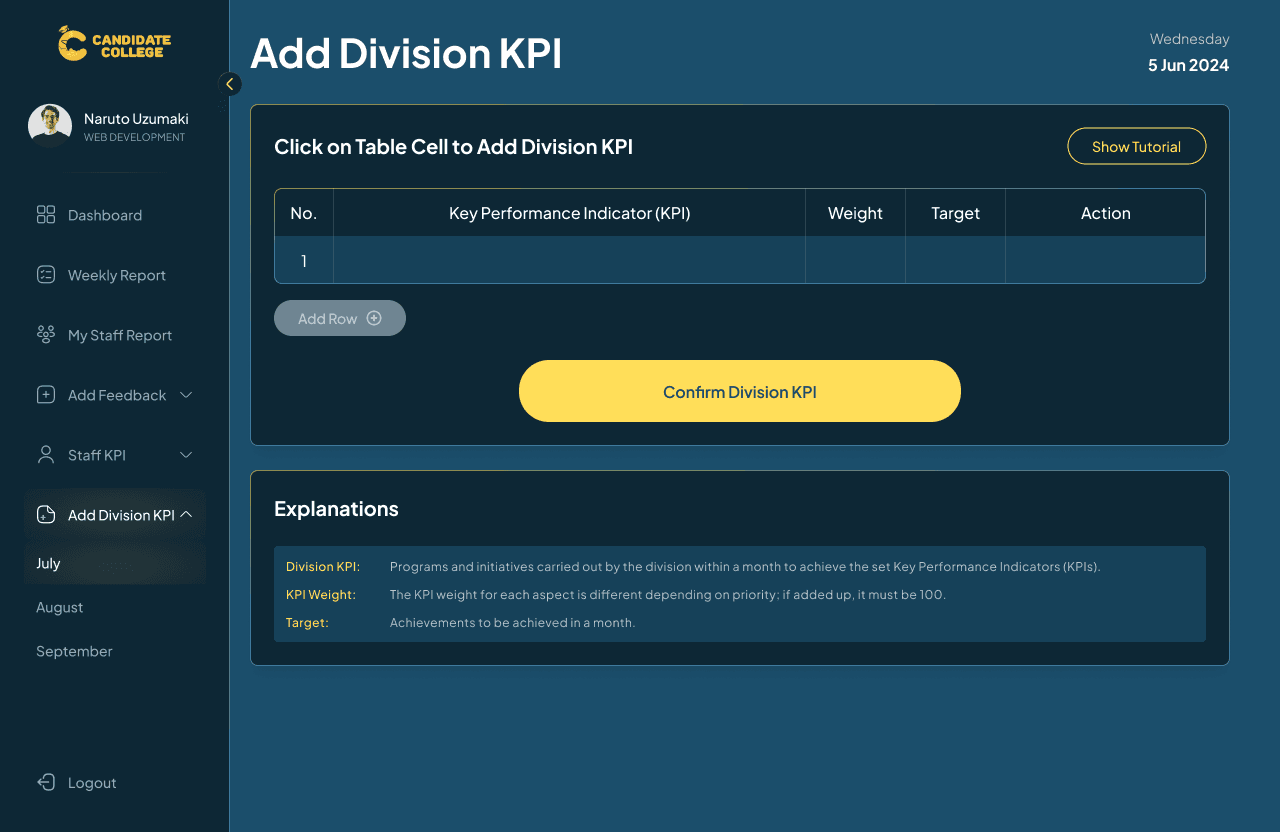 Another thing that the head & co-head can do is add division KPI each month, this is the work program that they will do that month with certain targets that will need to be achieved. Same as with other features, there will be a tutorial that will guide them about the features and information that need to be filled out.