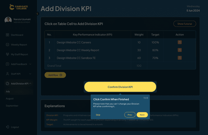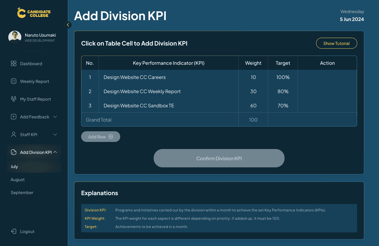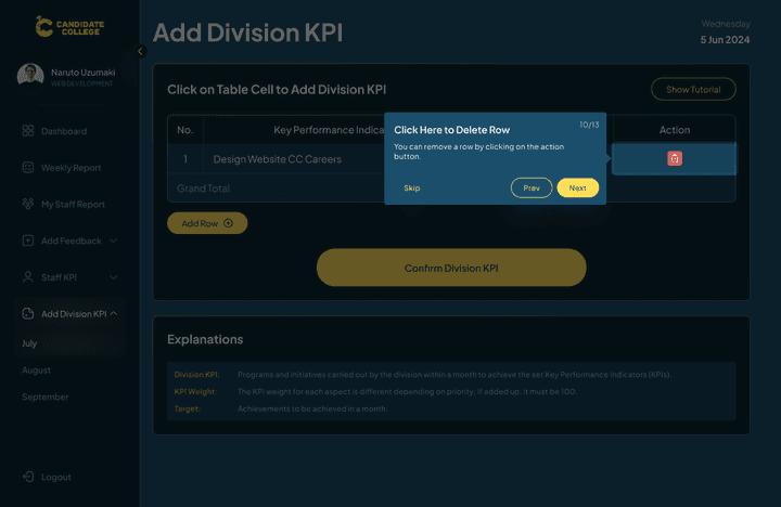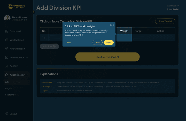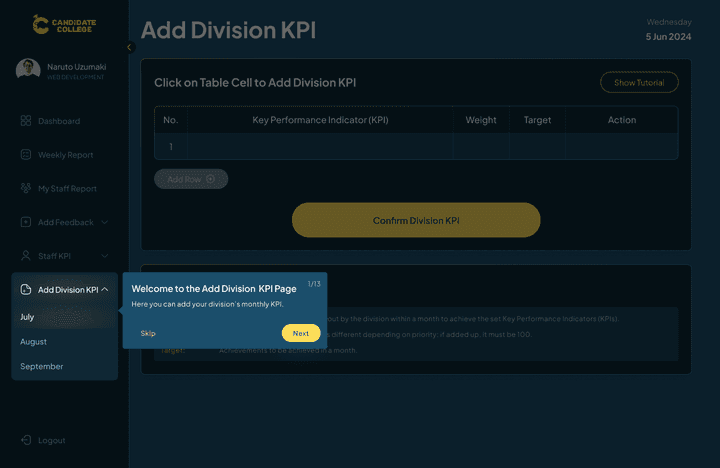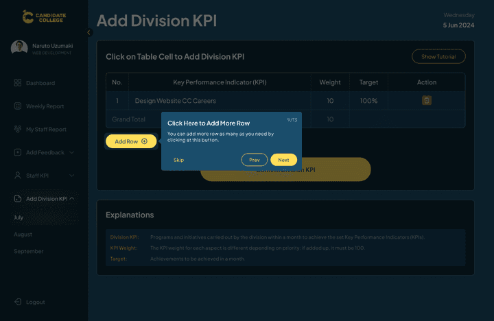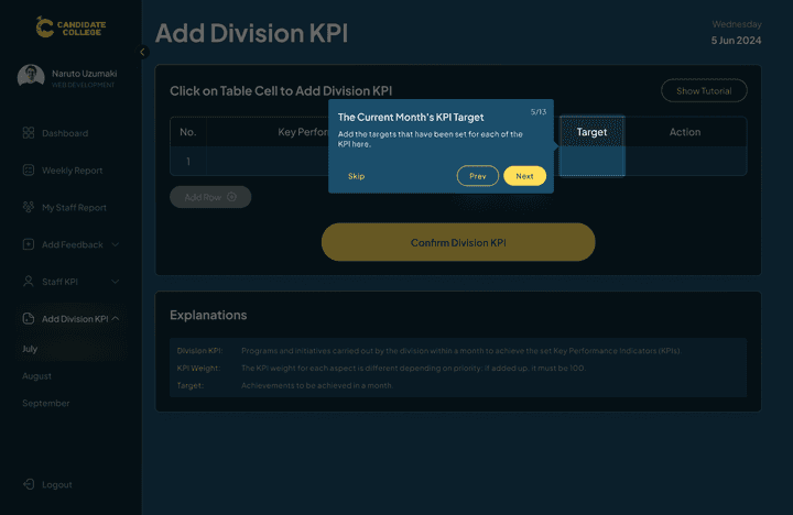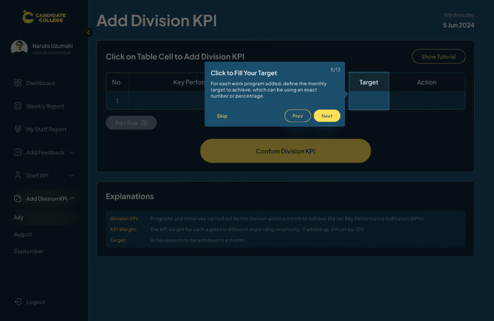Another thing that the head & co-head can do is add division KPI each month, this is the work program that they will do that month with certain targets that will need to be achieved. Same as with other features, there will be a tutorial that will guide them about the features and information that need to be filled out.