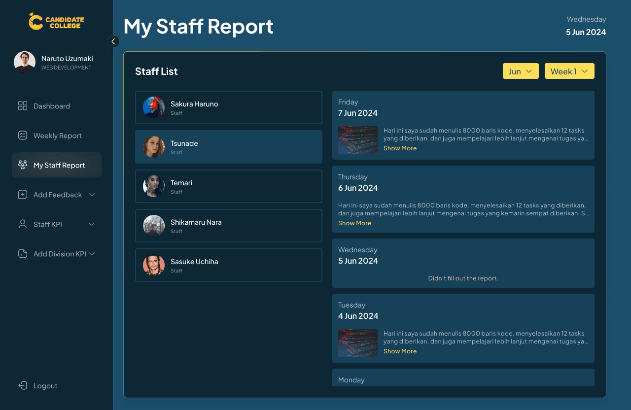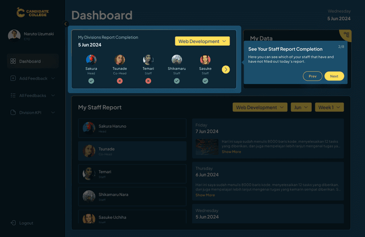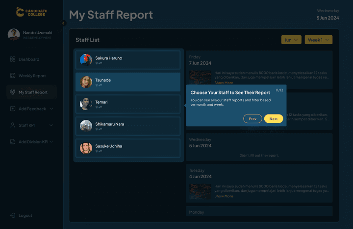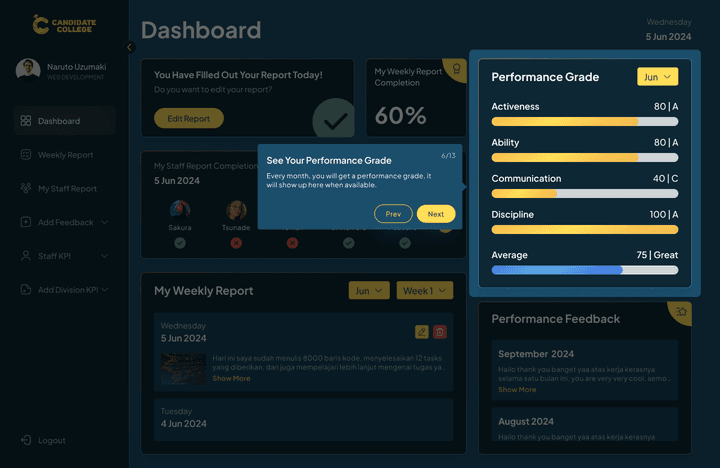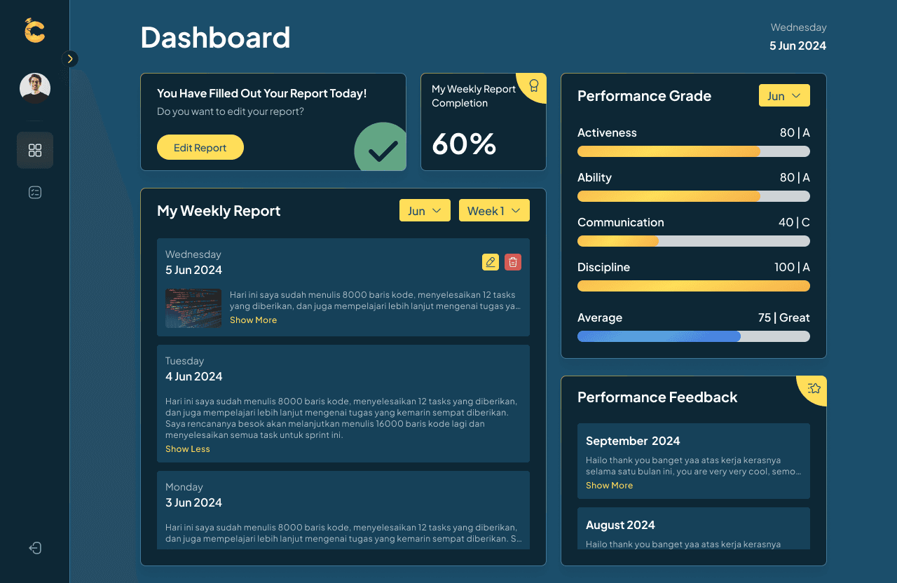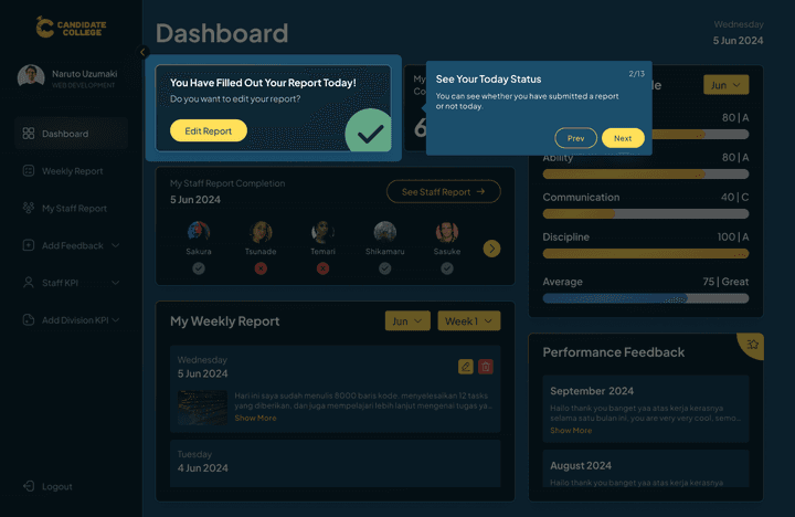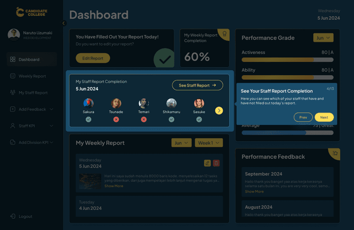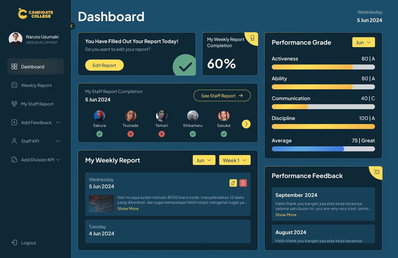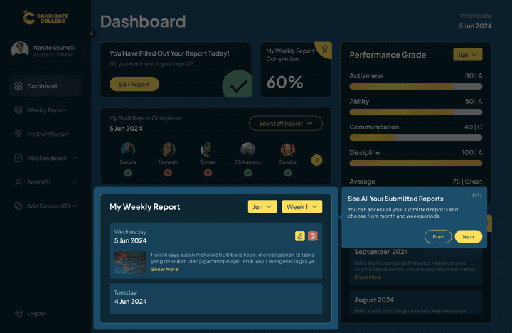 The main feature on the web is the dashboard which shows all information regarding the staff’s weekly report status, progression, monthly performance grade, and performance feedback. Users can know whether they have filled out today’s weekly report or not and see the percentage of this week's report.