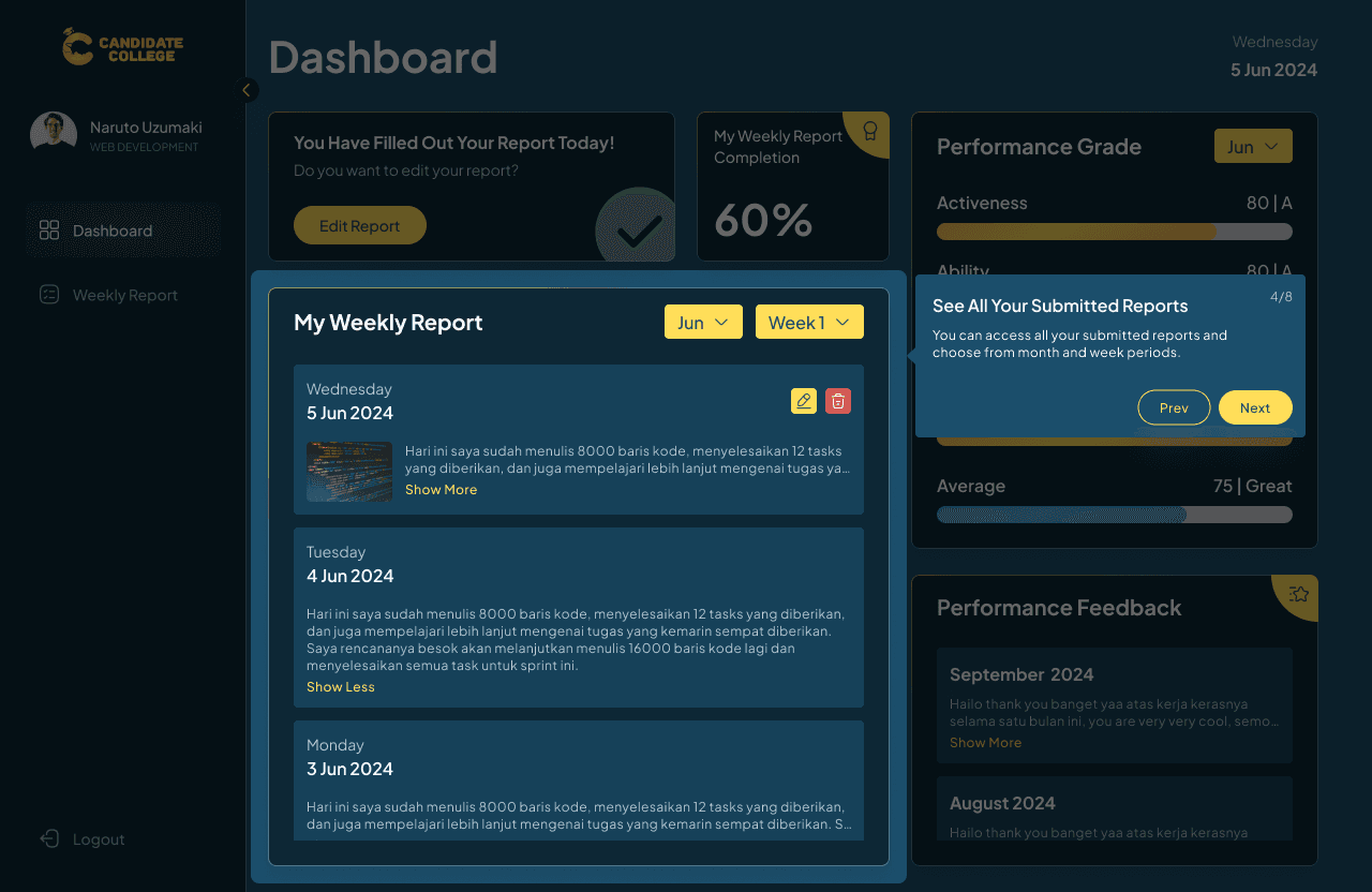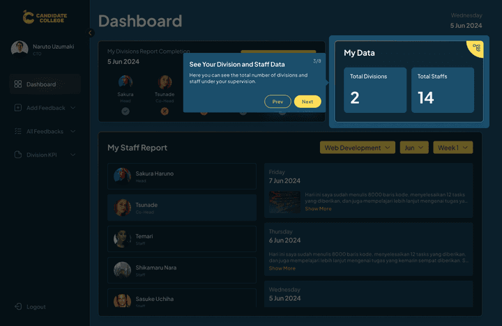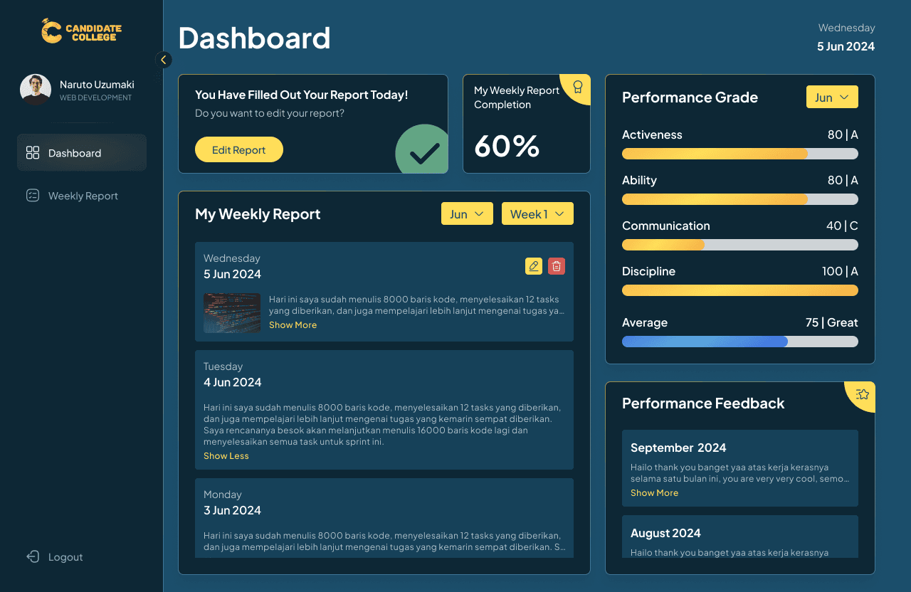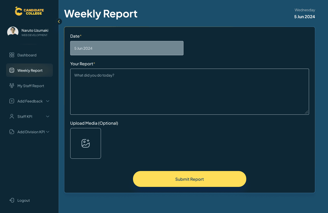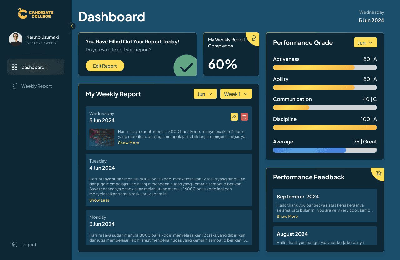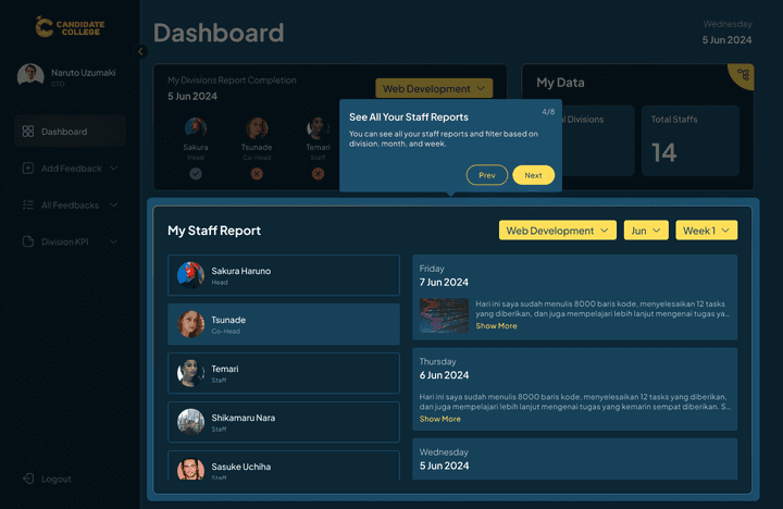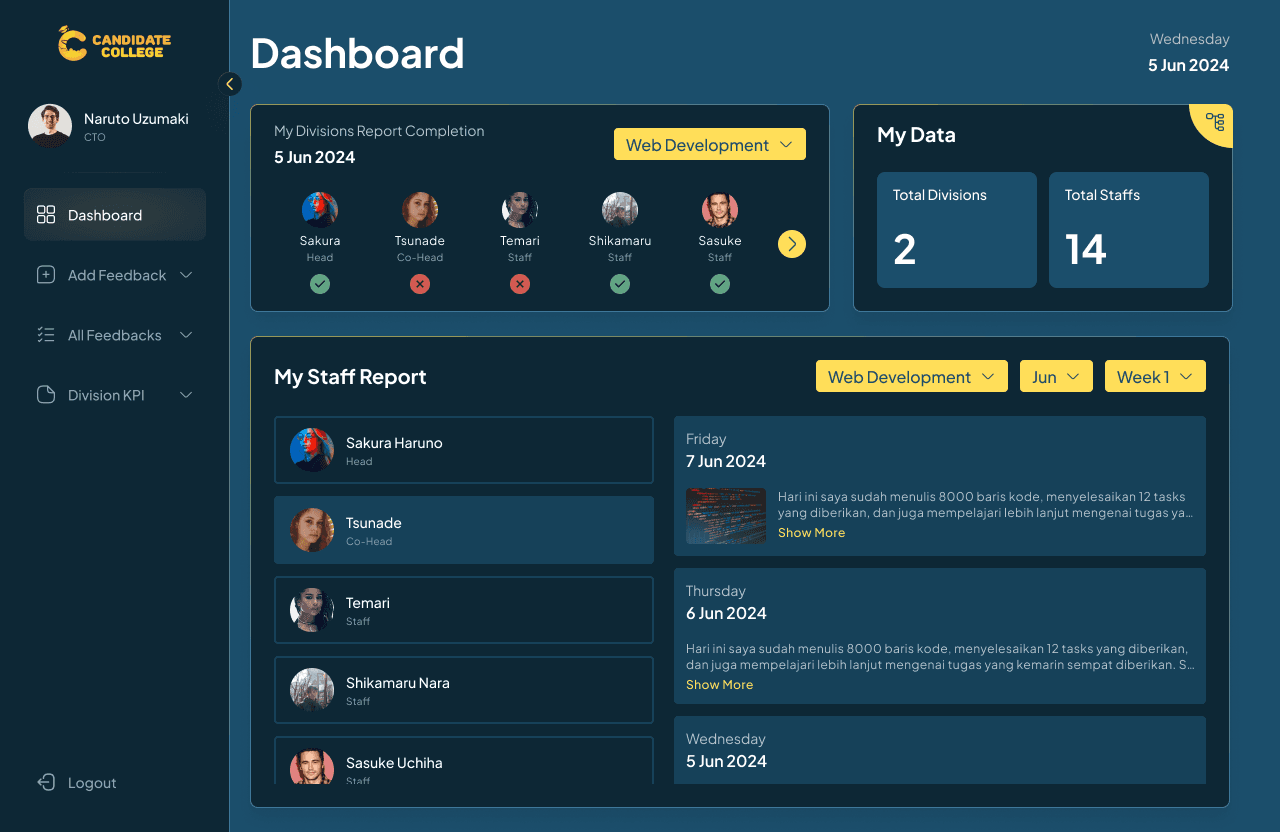 The main feature on the web is the dashboard which shows all information regarding the staff’s weekly report status, progression, monthly performance grade, and performance feedback. Users can know whether they have filled out today’s weekly report or not and see the percentage of this week's report.