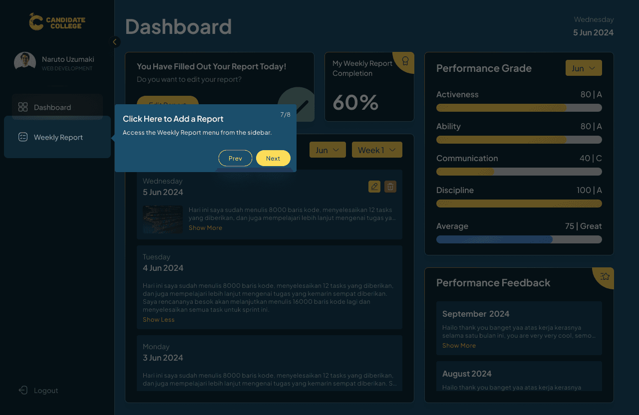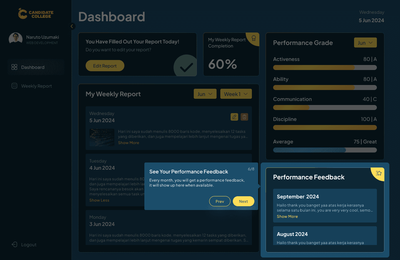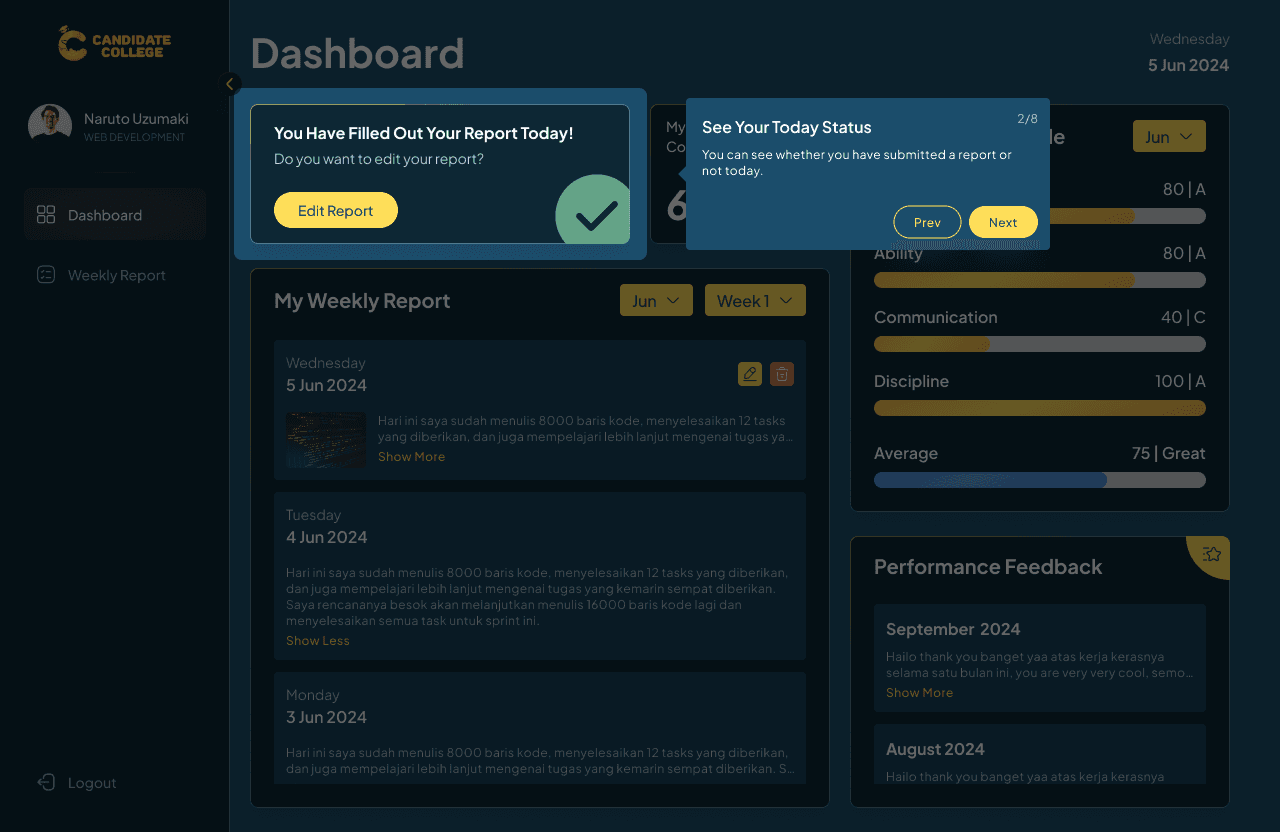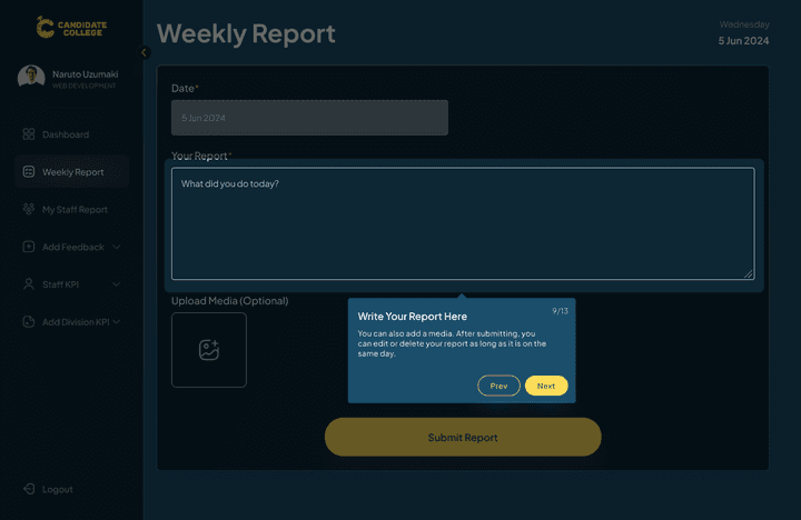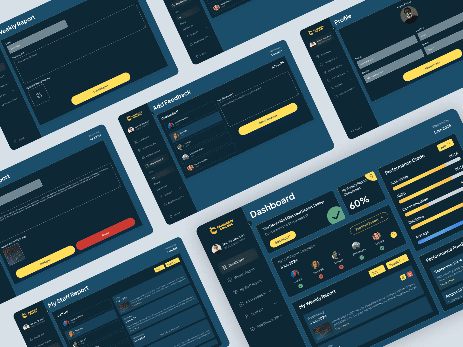 The main feature on the web is the dashboard which shows all information regarding the staff’s weekly report status, progression, monthly performance grade, and performance feedback. Users can know whether they have filled out today’s weekly report or not and see the percentage of this week's report.