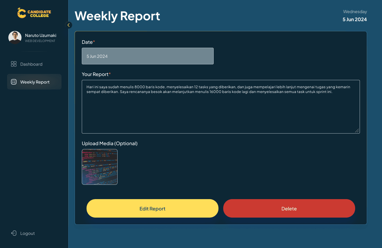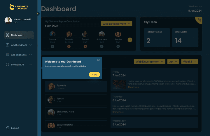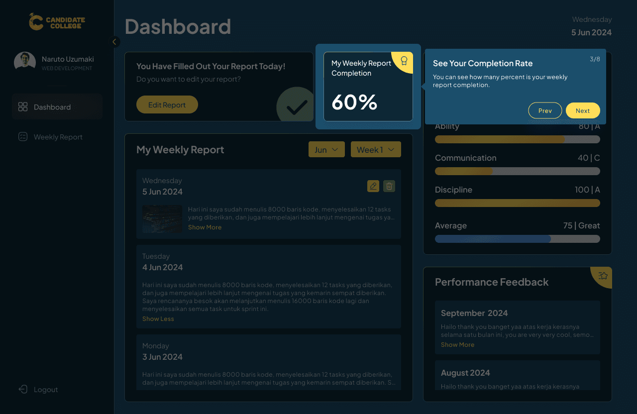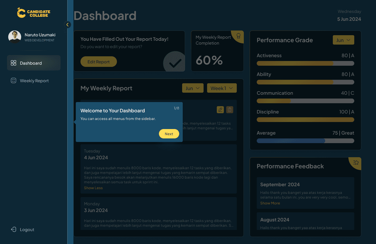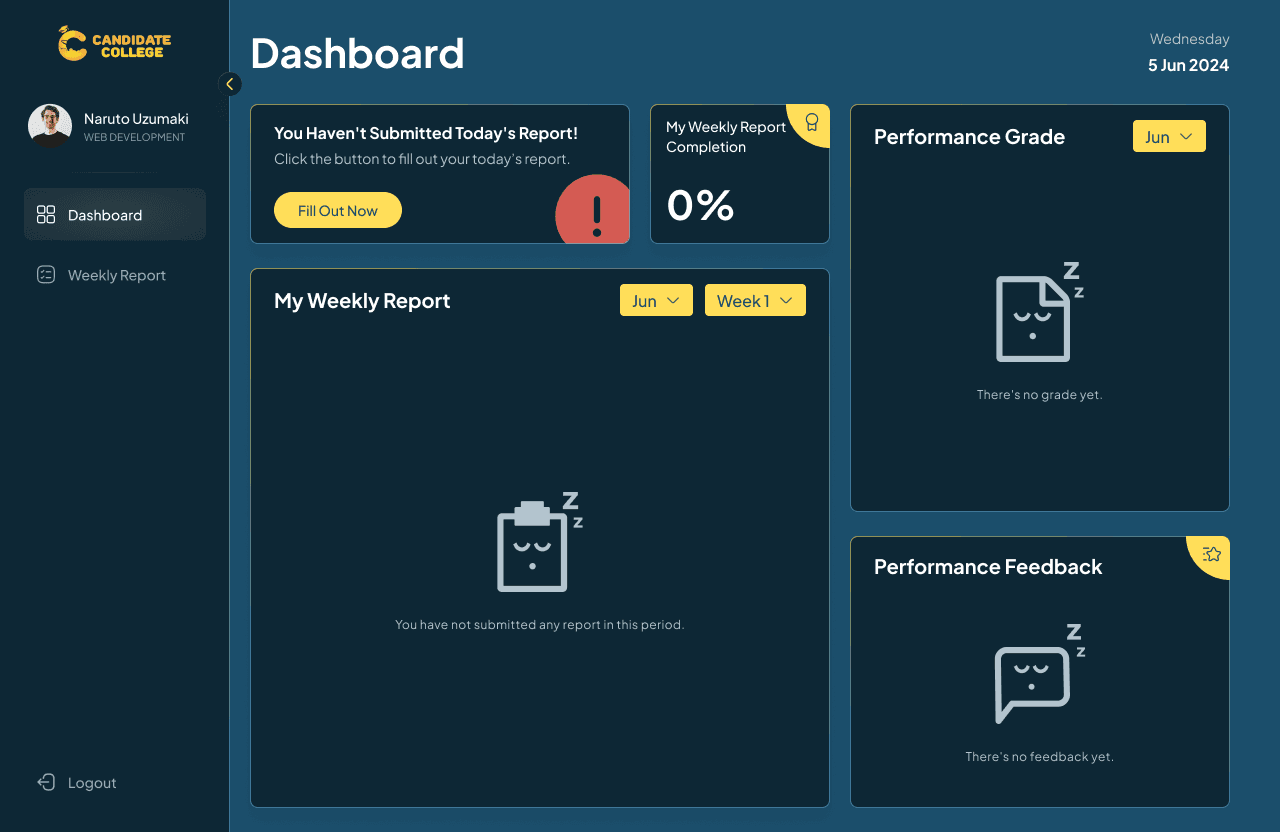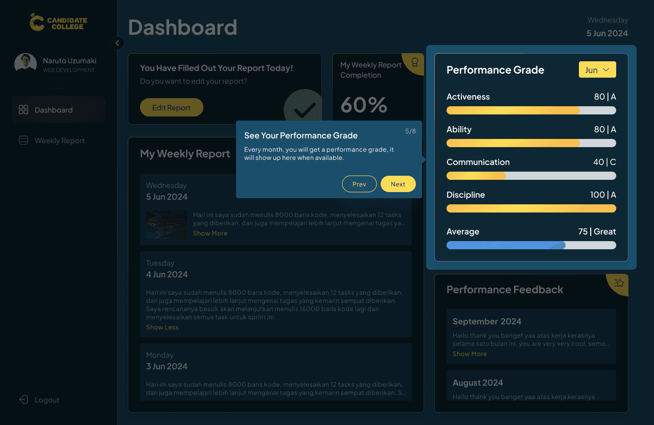 The main feature on the web is the dashboard which shows all information regarding the staff’s weekly report status, progression, monthly performance grade, and performance feedback. Users can know whether they have filled out today’s weekly report or not and see the percentage of this week's report.