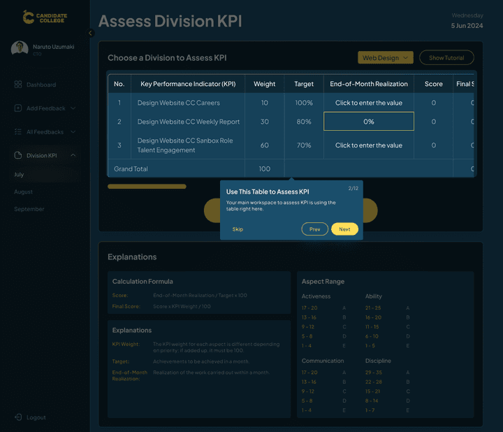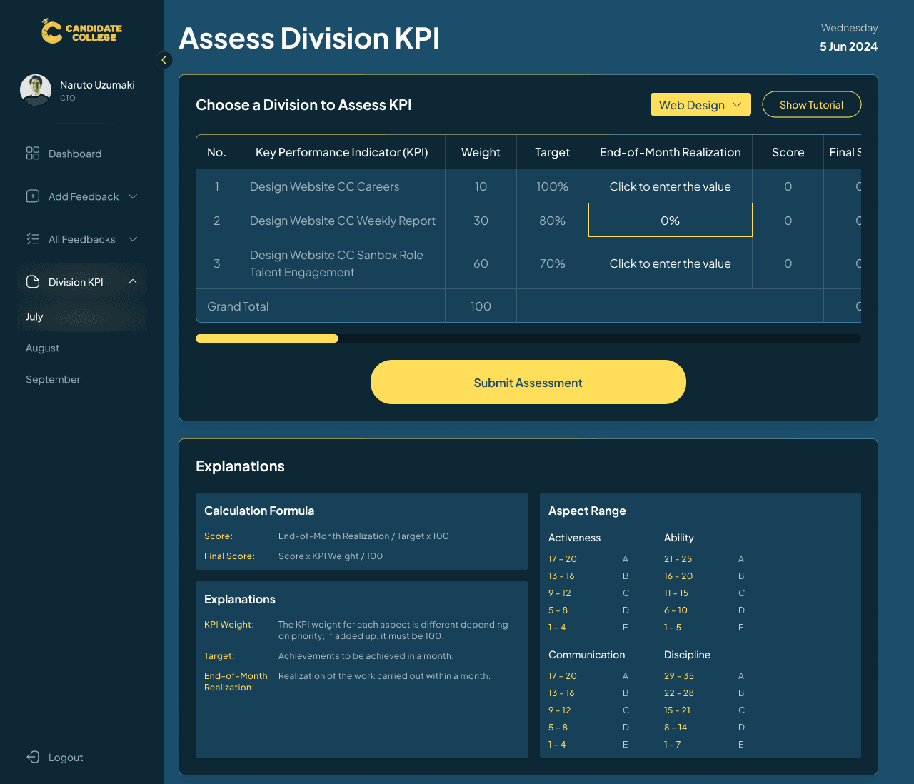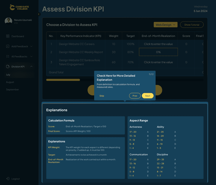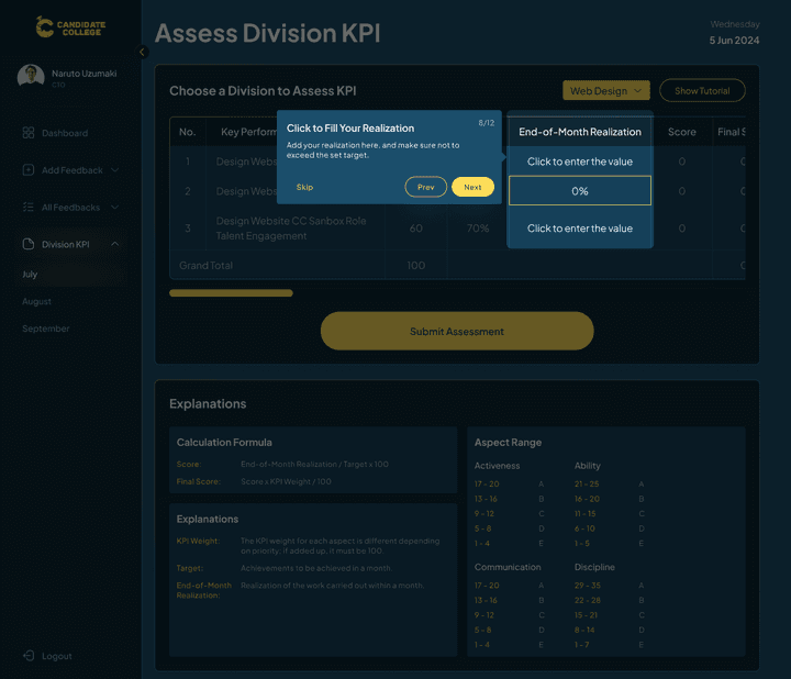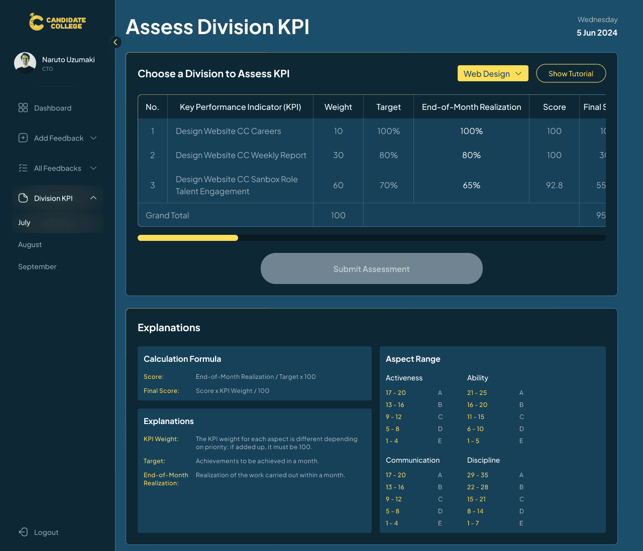 When assessing, users just need to fill out the End-of-Month Realization column. They need to enter the real target achieved for every work program. For example, if a work program is targeted to achieve 100% completion at the end of the month but in reality just achieves 80%, then C-level can just write 80% in the Realization column. After filling out, a score and final score will automatically be generated. There is also an explanation section under the table in case users want to know more about what every information on the table means.