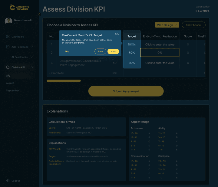 The first one is the Assess Division KPI on the C-level version. For context, each month, every division needs to fill out their target of the month, we call it the Work Program. Those work programs will have a weight and target based on the difficulty of it to be completed at the month. The Head & co-head are the ones responsible to create a work program for their division each month and then at the end of the month, the C-level will asses whether the target has been achieved or not.