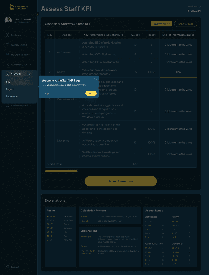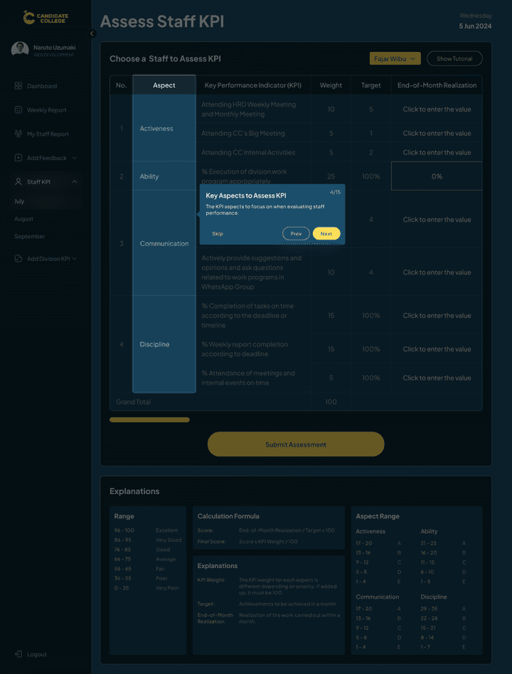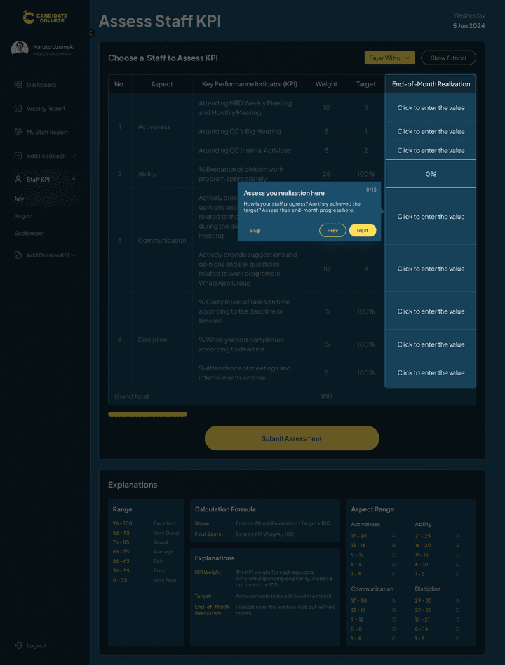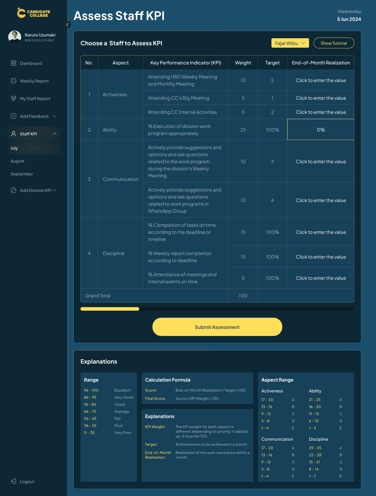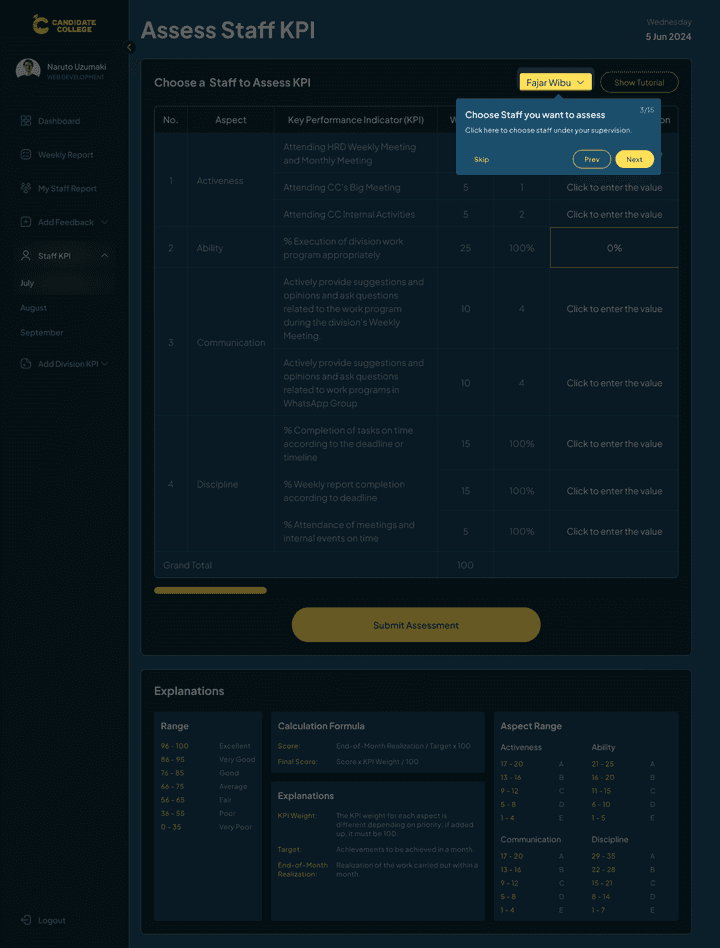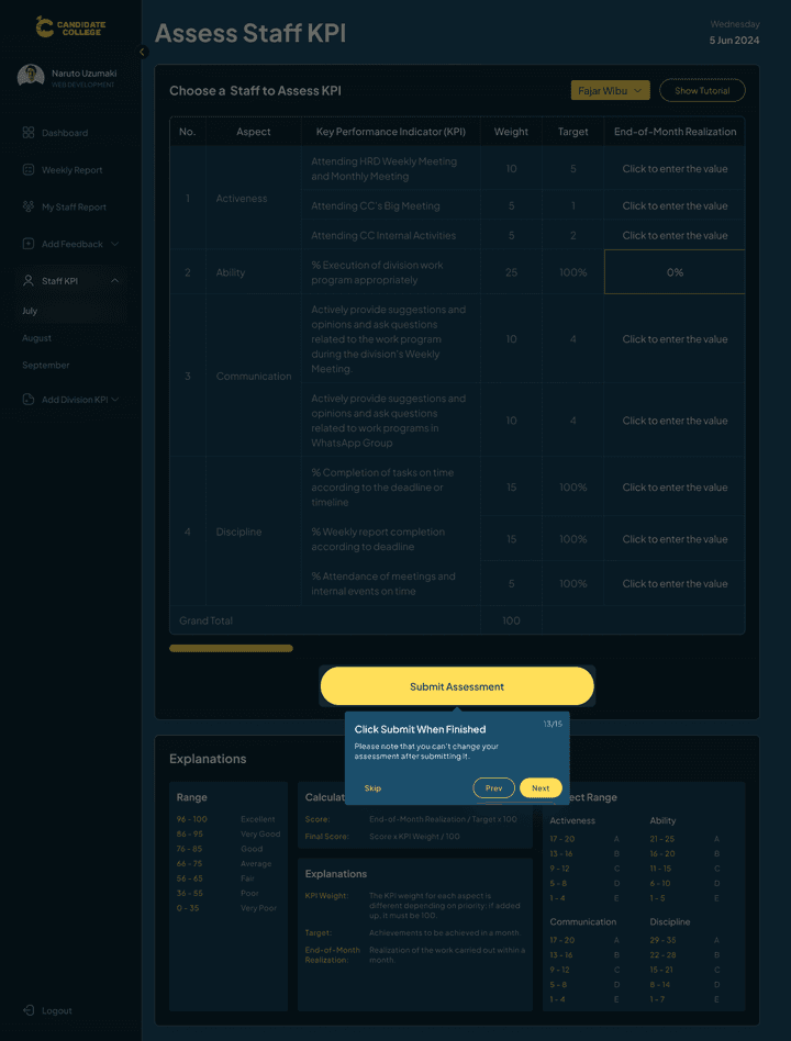 The aspect criteria are already set up and will be the same each month so what the users do here is just to choose a staff and then asses their Realization based on the criteria like how much point for their activeness this month and more. The Head & co-head will need to asses every staff on their division one by one and then submit it, the submitted data will go to the performance grade section on their staff dashboard.