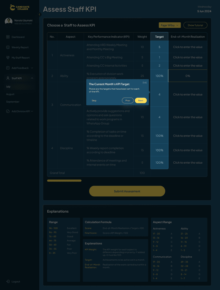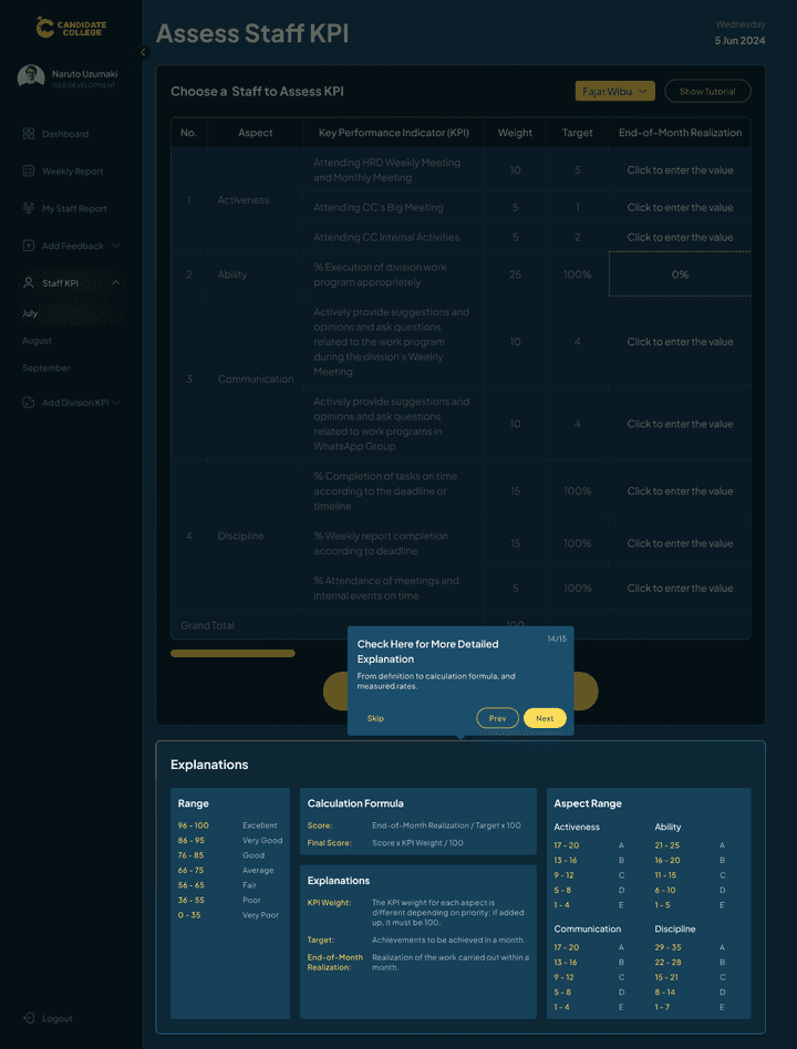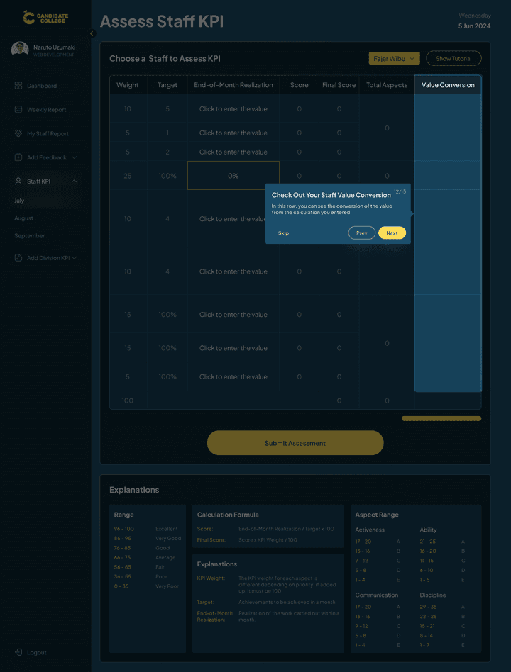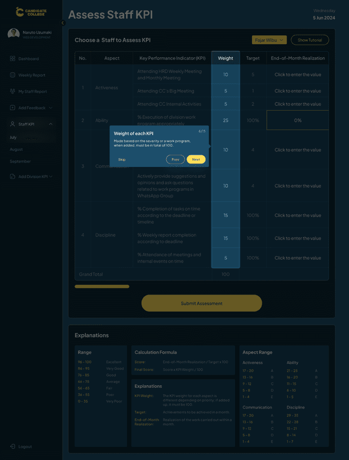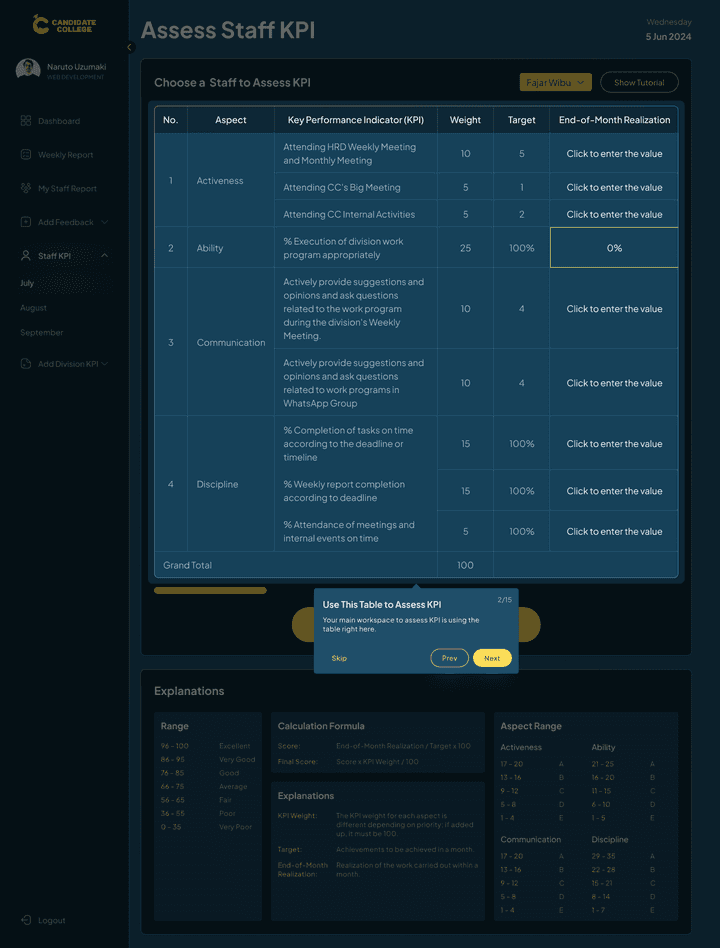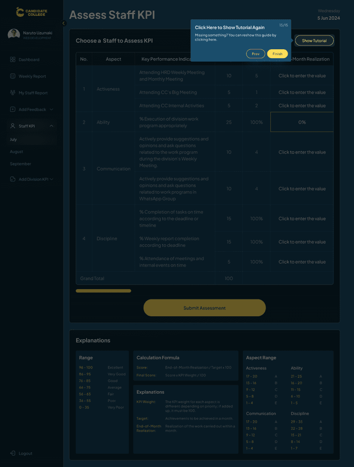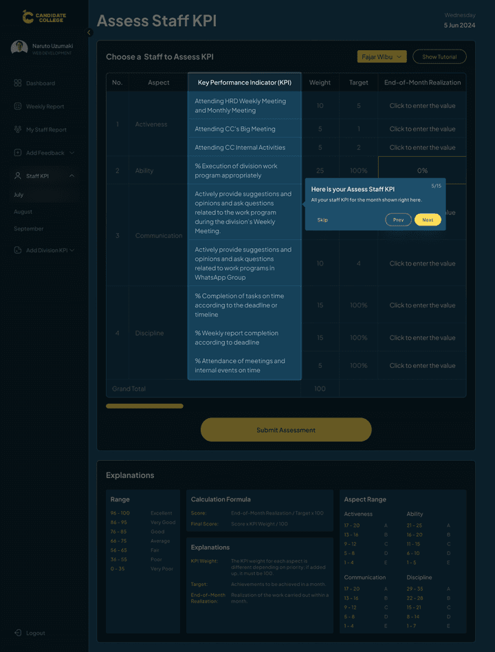 The aspect criteria are already set up and will be the same each month so what the users do here is just to choose a staff and then asses their Realization based on the criteria like how much point for their activeness this month and more. The Head & co-head will need to asses every staff on their division one by one and then submit it, the submitted data will go to the performance grade section on their staff dashboard.