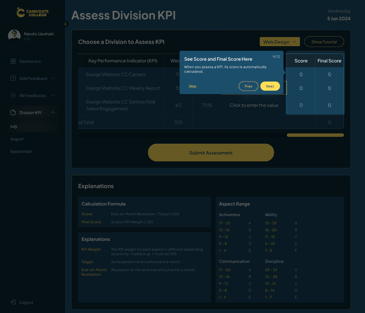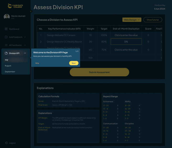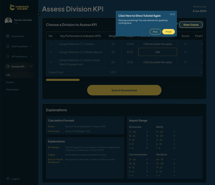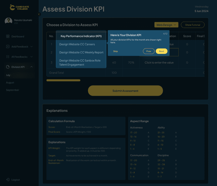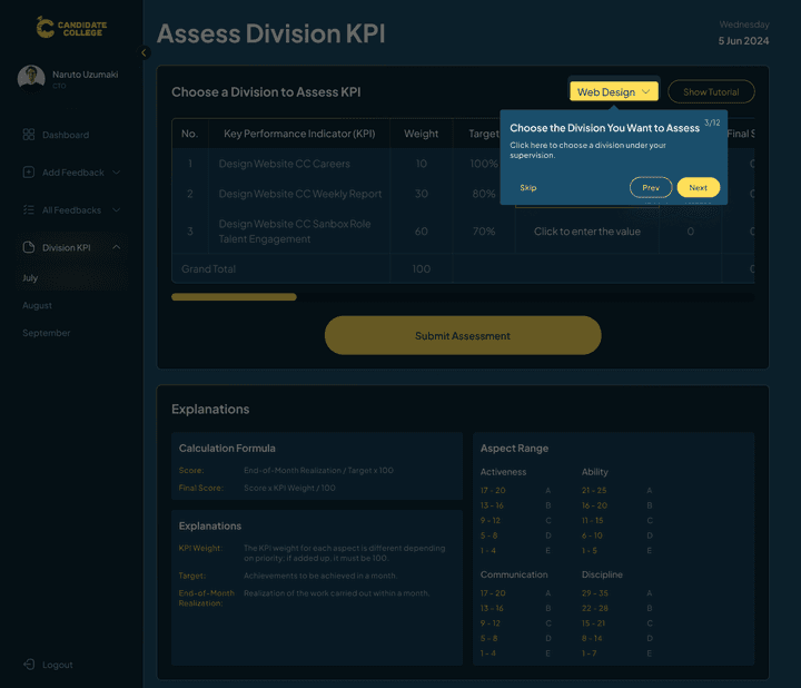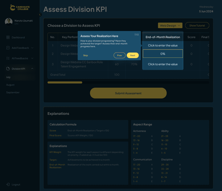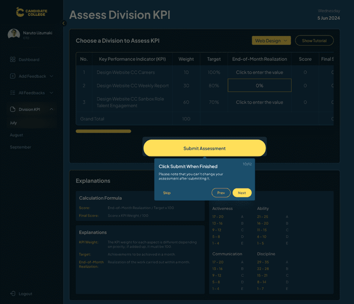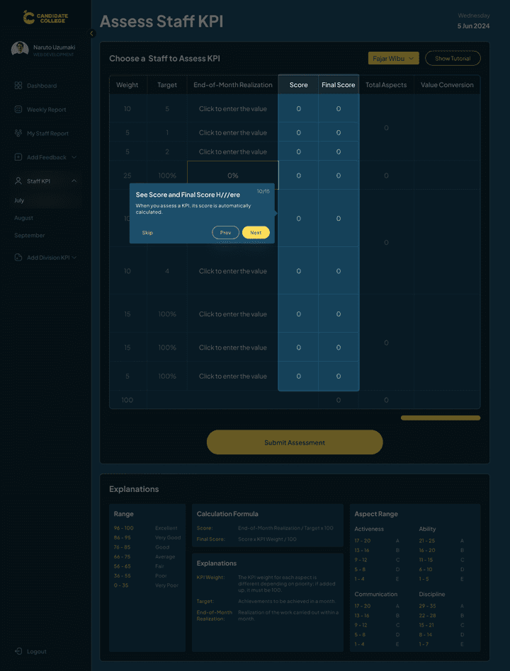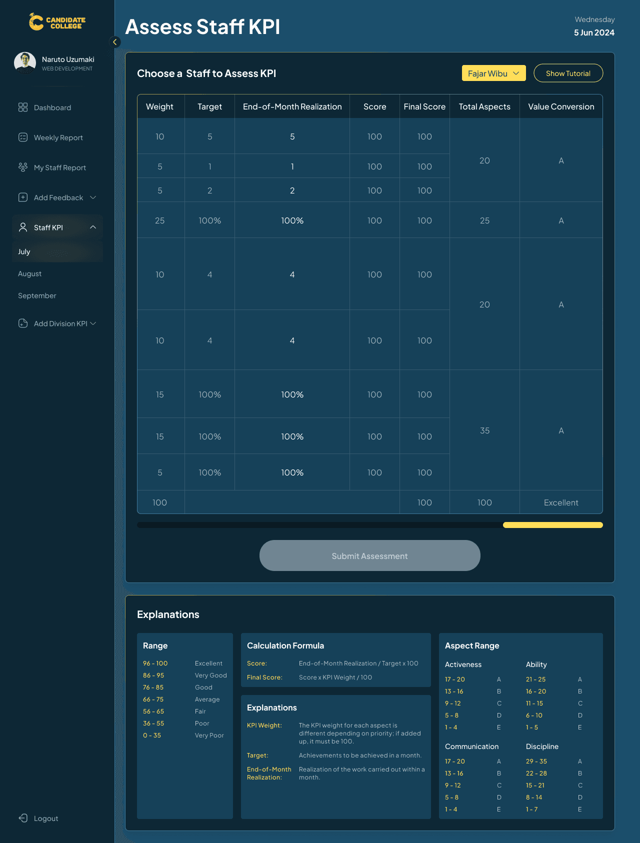 The aspect criteria are already set up and will be the same each month so what the users do here is just to choose a staff and then asses their Realization based on the criteria like how much point for their activeness this month and more. The Head & co-head will need to asses every staff on their division one by one and then submit it, the submitted data will go to the performance grade section on their staff dashboard.
