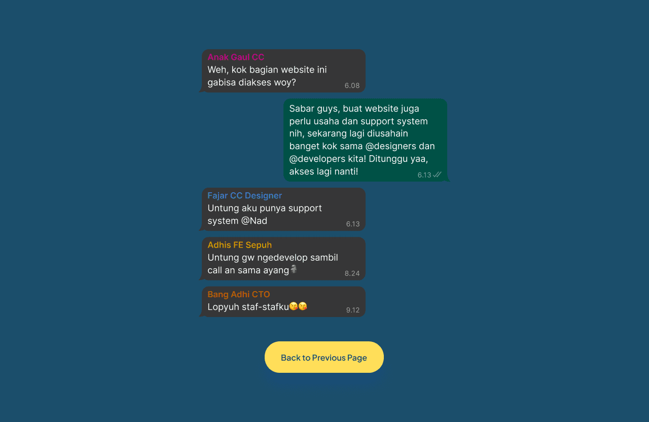 Another thing that is requested is a page to show that a certain part of the web is still in development, something like a 404 page. The CTO wanted the page design to be funny and extraordinary so I had to look for any exciting ideas to be used in this page. My final decision is to create this fun documentation of our WhatsApp chat that displays a discussion about a user who asks why this feature is not available yet and replied in the tone of all our team is working hard for this so please stay tuned. This design is instantly approved by the CTO and I myself personally proud to have created this funny page design.