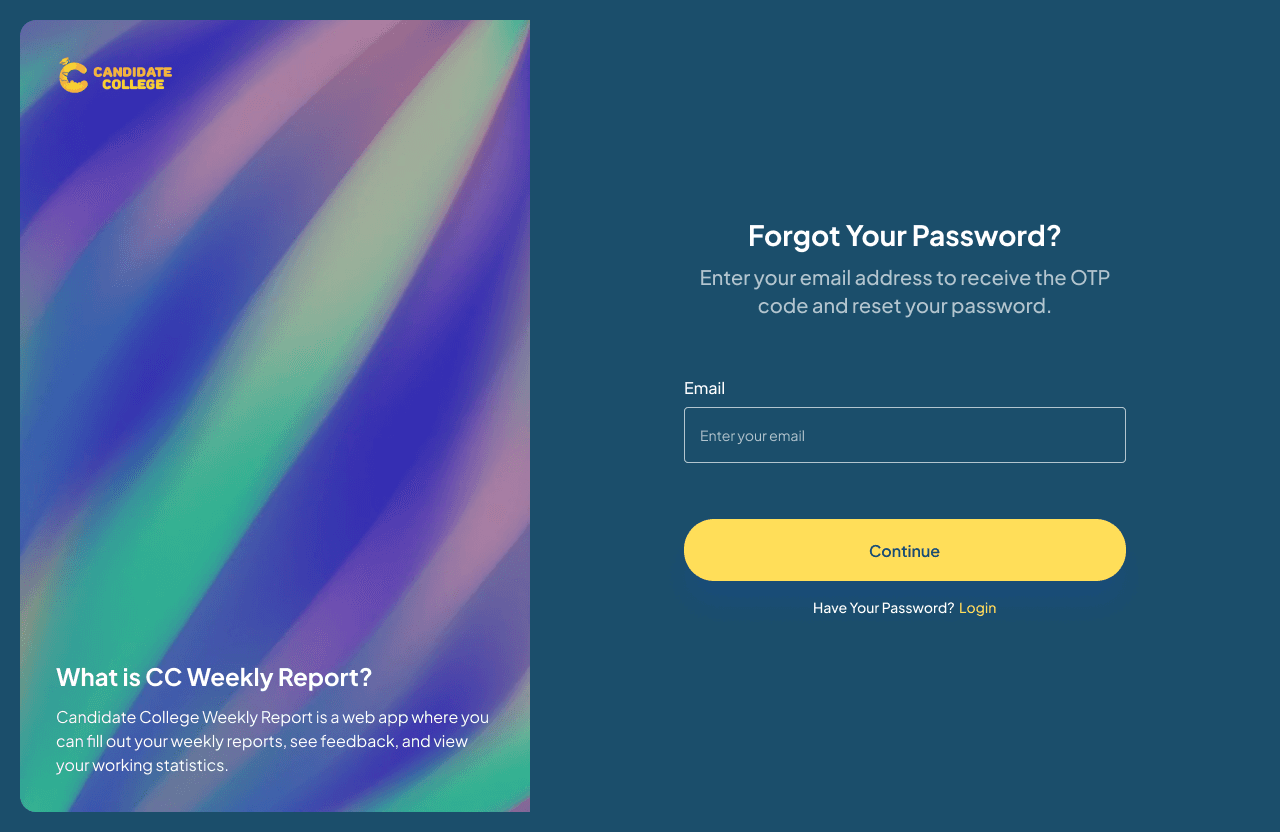 After filling out the form, users will get an OTP code on their email and they need to input it in the verification page to receive a random password to log in to CC websites like CC Weekly Report.