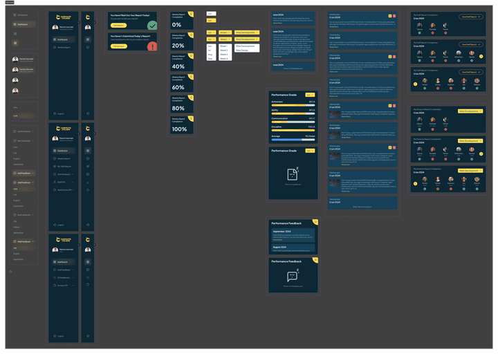 This project will have 3 use cases which are for staff, head & co-head of divisions, and C-levels. On every use case, there is a special flow with respective features that are not available on other flows. Here is the first flow which is for staff. The functionality here is just a basic dashboard to track staff’s weekly report progress, view performance grades and feedback, and fill out their report.
