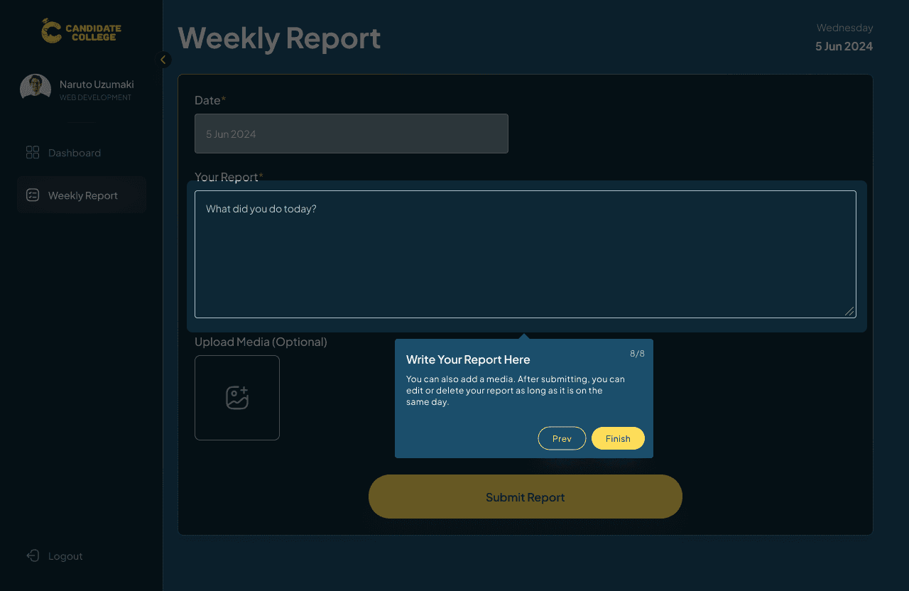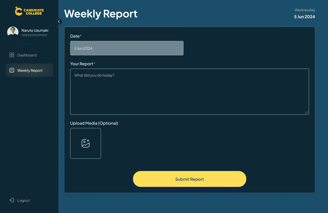 Another main feature is the page to fill out the report itself. Users won’t be able to choose what date they want to fill which means that this report should be filled daily and when they don’t, they can’t get back to fill it. This was the request from the CTO but later revised so that users can choose a date on that week so as long as the week hasn’t ended, they can still fill report on the missing days.