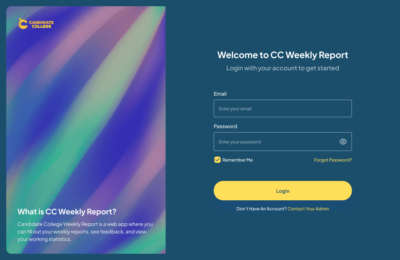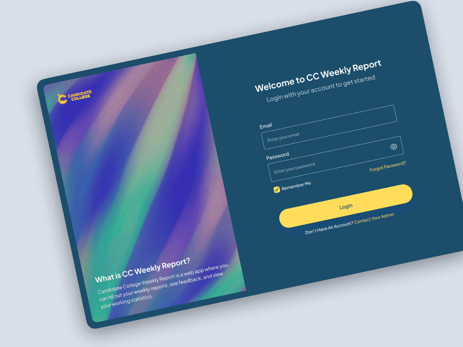 The design here is quite common in the pattern of login page design with an animated illustration on the left side that also explains what CC Weekly Report, is and the login form on the right side. For the colour scheme, as I said already, this colour style was already established with other previous CC products so I had to follow it even though it was not really good. And yes, the concept of this website is dark mode so the colours are kind of deep and dark.