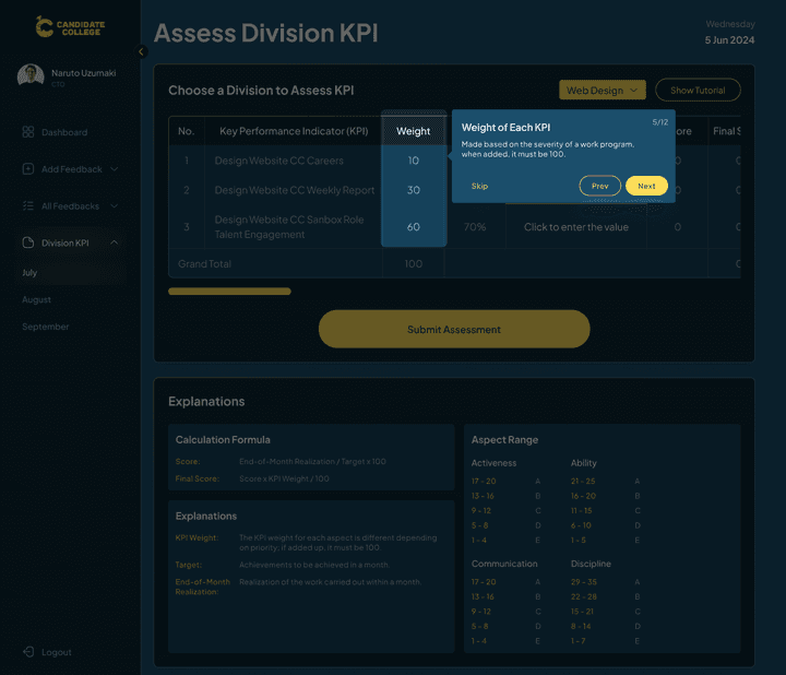 Another addition that is given is to add a feature to asses KPI on head & co-head and C-level version of CC Weekly Report. What is a KPI, a Key Performance Indicator (KPI) is a measurement that can be given to certain parts of the organization to assess whether their work meets the established criteria or not. In this case, the head & co-head will asses KPIs for their staff, while the C-level will asses KPIs for their managed divisions.
