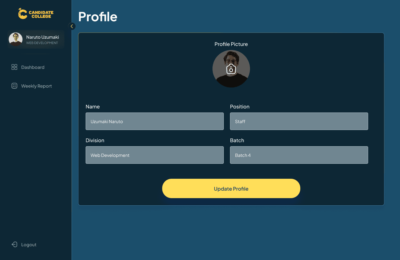 On the profile page, users can’t change anything besides their profile pictures, this due to their data is already fixed on the database and changing it would not be possible.