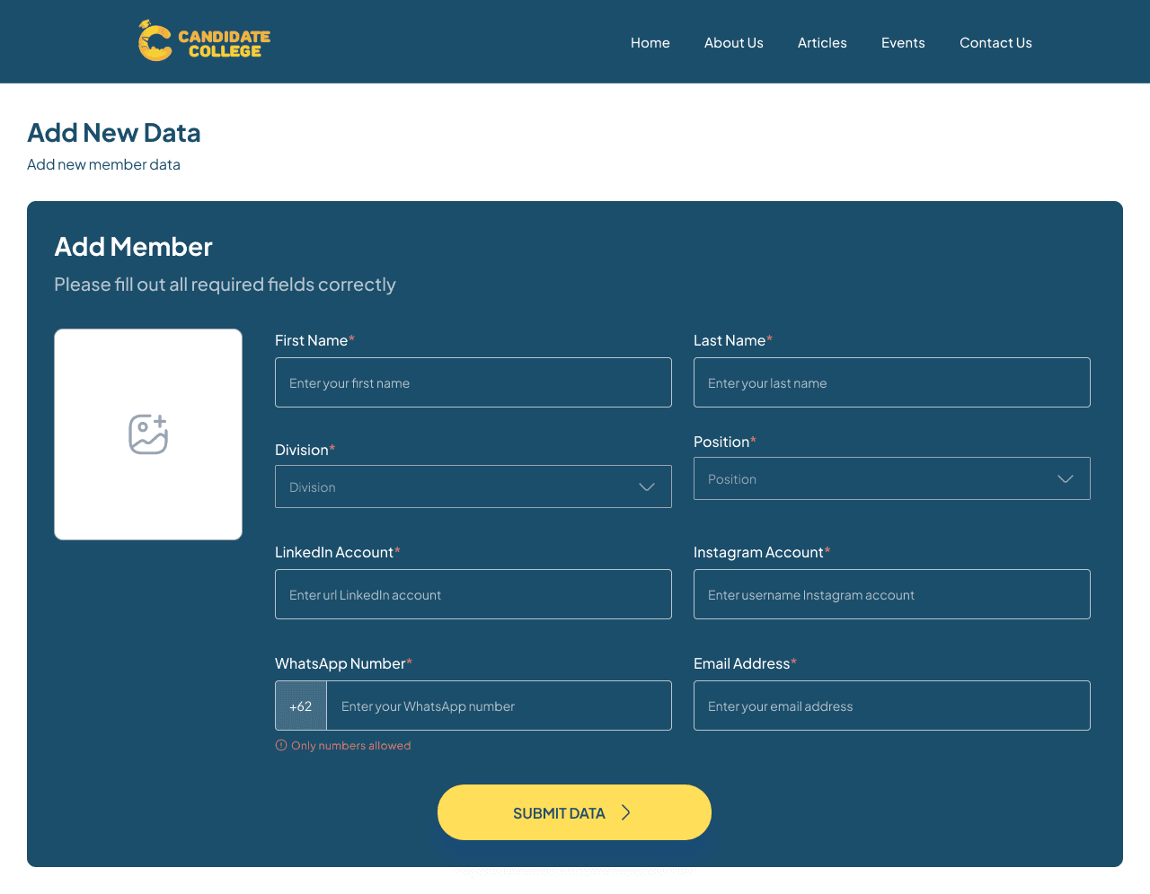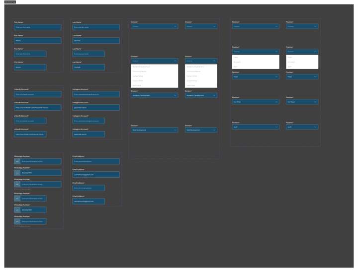 The first step is filling out this add member form which consists of personal data, social media, and contact. Why the design is different from the previous Weekly Report page is that this form previously belonged to the flow of CC's main website. The previous flow is member filling out this form and their profile will be available to view on the division page of the website, some kind of our team page. But now, other than just showing it on the division page, the CTO also want this form to be in a flow to create an account to access all CC websites. With all the contact information needed in this flow, it’s possible to create an account just by using this information.