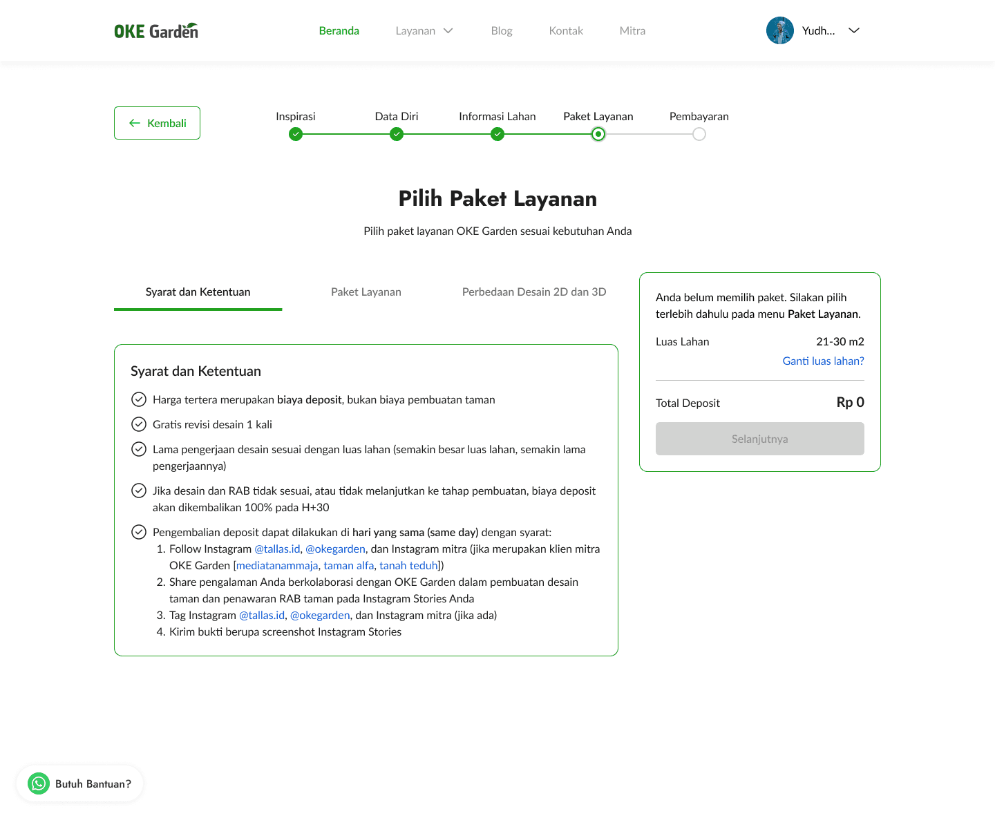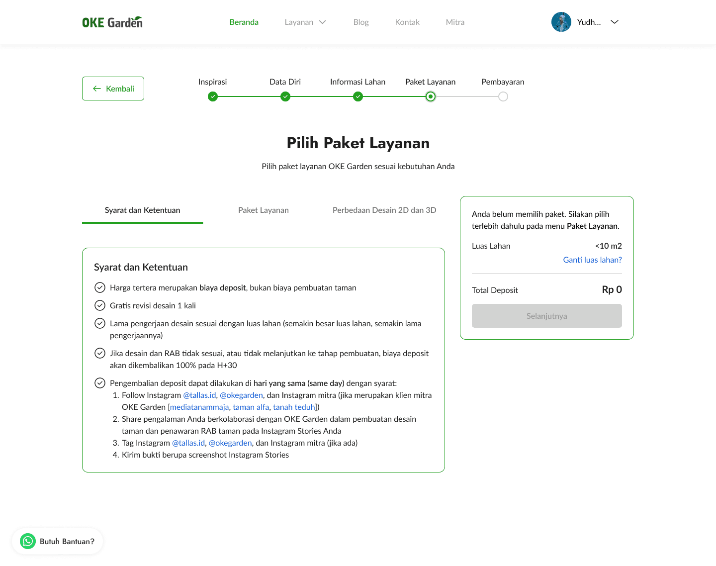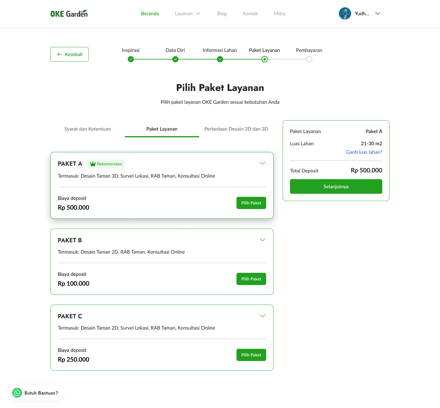 After filling out all the information needed, they will taken to this service package page. The land wide that users choose on the dropdown in the previous page will be used as a base price of the service package. For example, when users choose that their land is under 10 m2, the package price will differ from when they choose another landwide like 21 - 30 m2. OKE Garden did have different pricing for different land wide since it will require more resources to design and build gardens of different sizes.