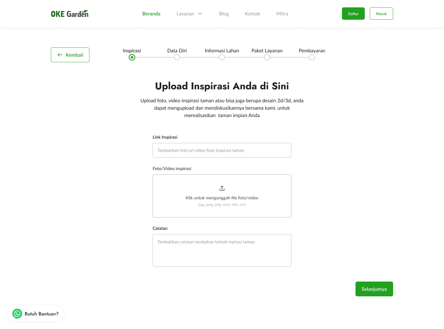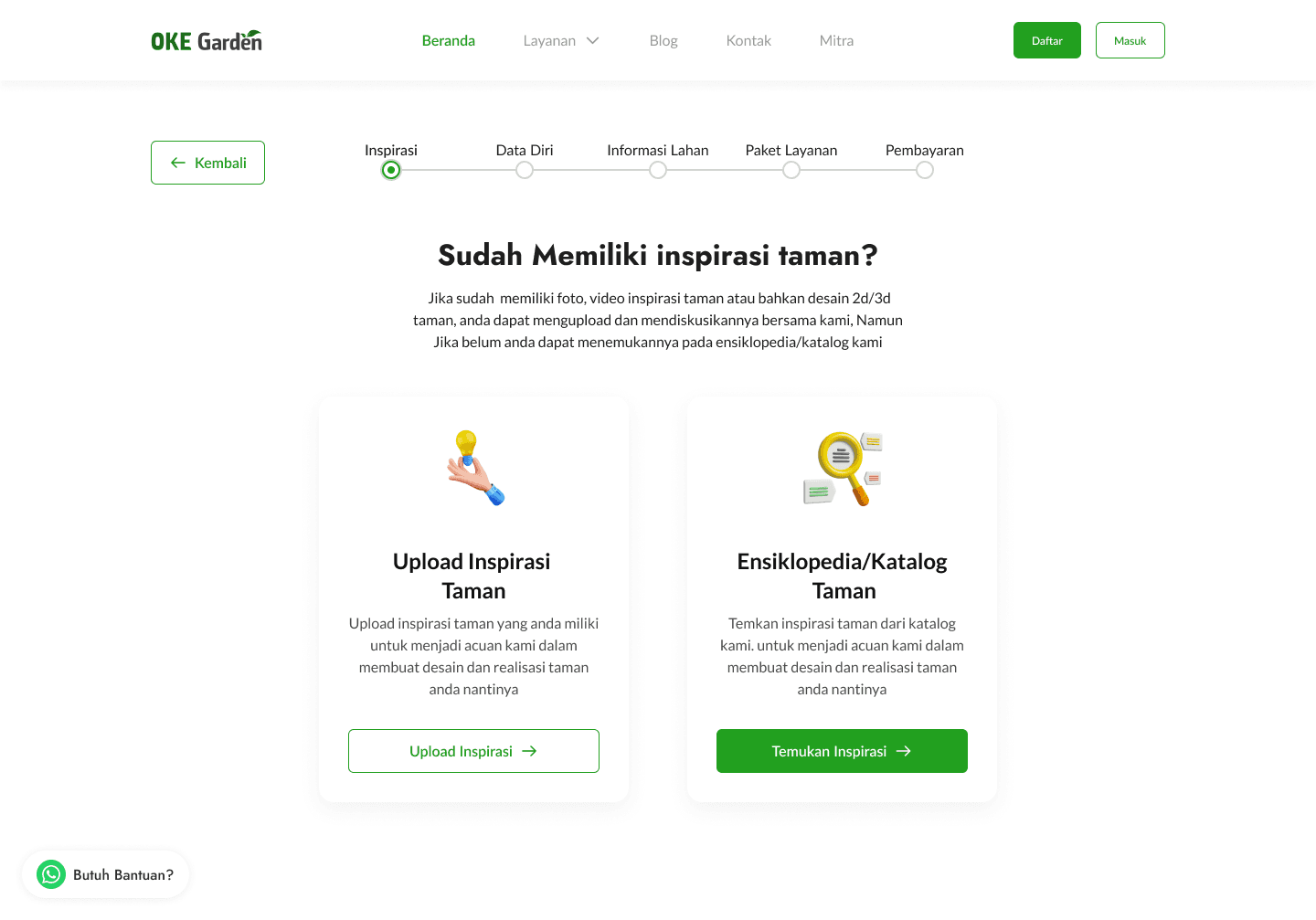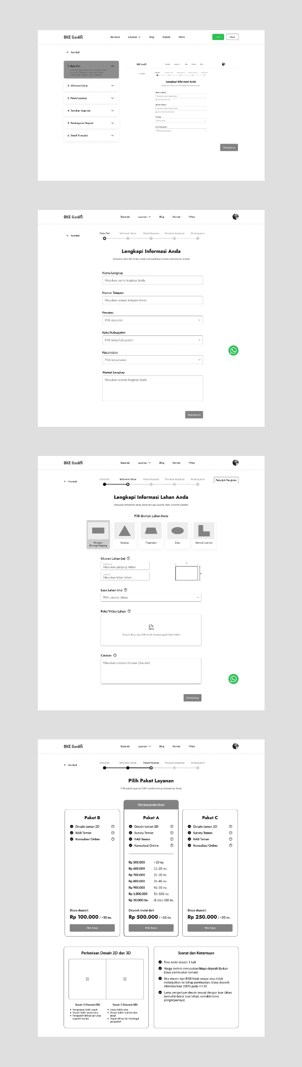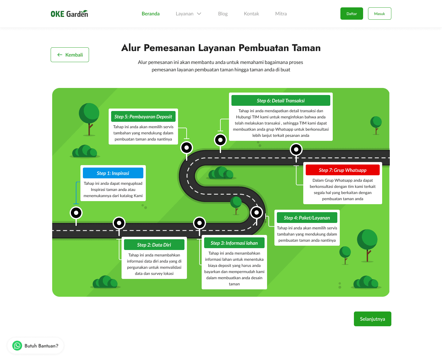 The design here is created as a road with each point to make it easier to understand for users to follow the journey. The illustration here uses a green scheme that matches the OKE Garden brand. For the page itself, we designed it in Indonesian, with a layout like a form flow, so when users click on next, it will take them to a similar page that resembles a flow. There is also a floating WhatsApp button just in case users are confused and want to ask directly to the team via WhatsApp.
