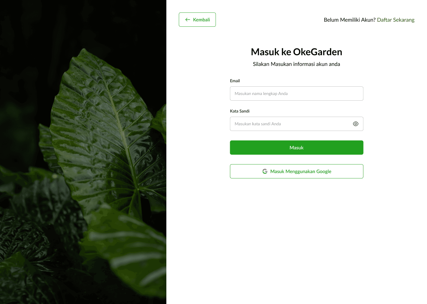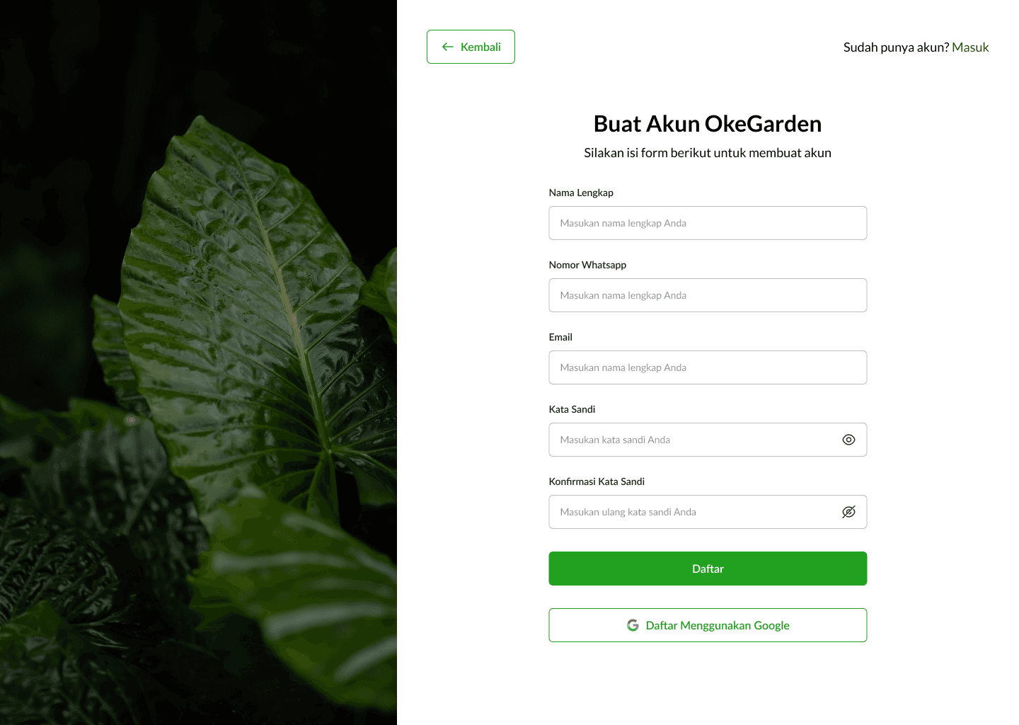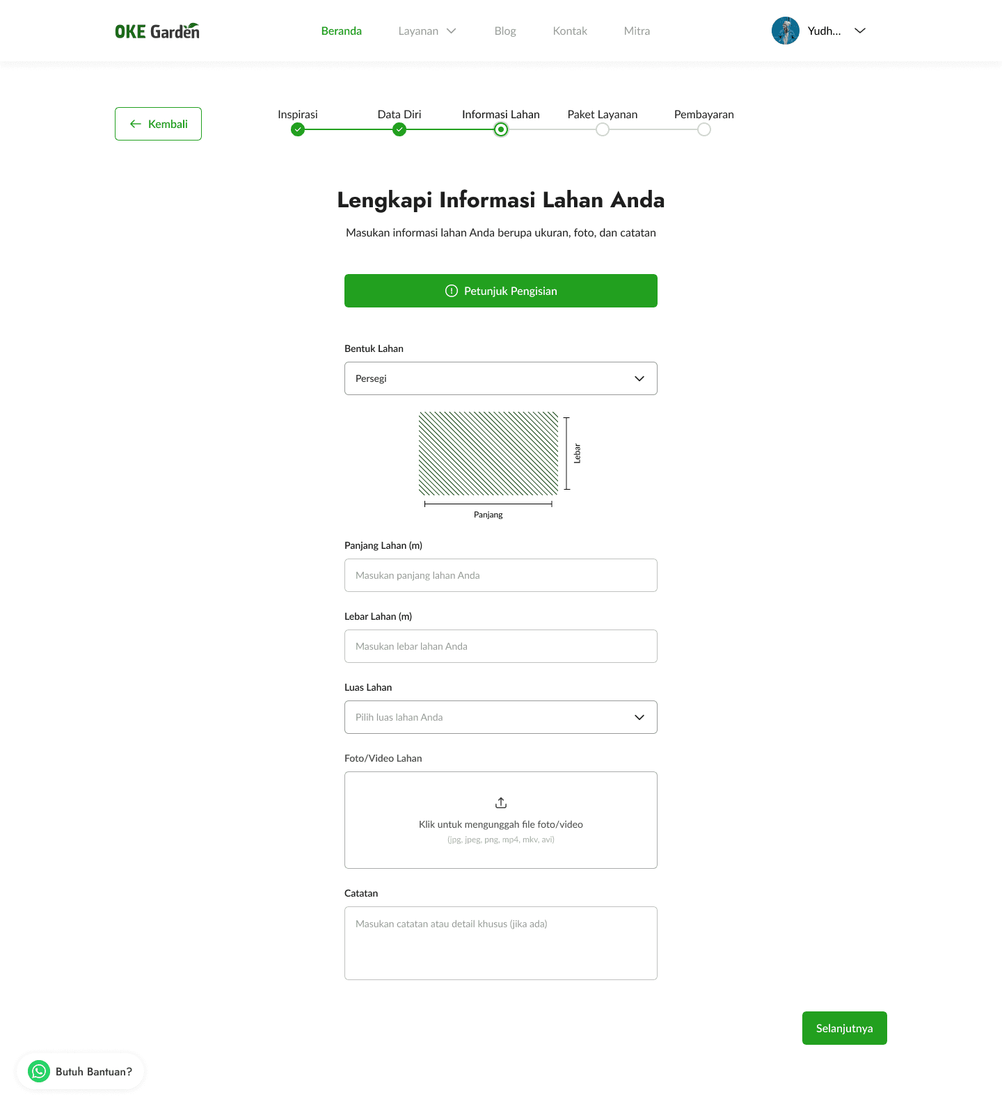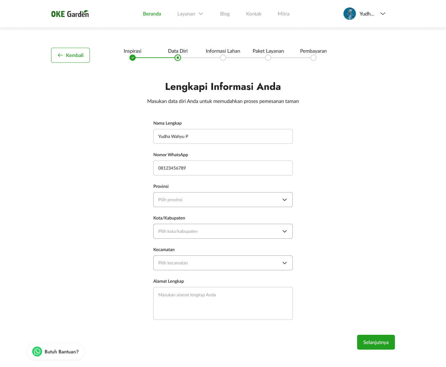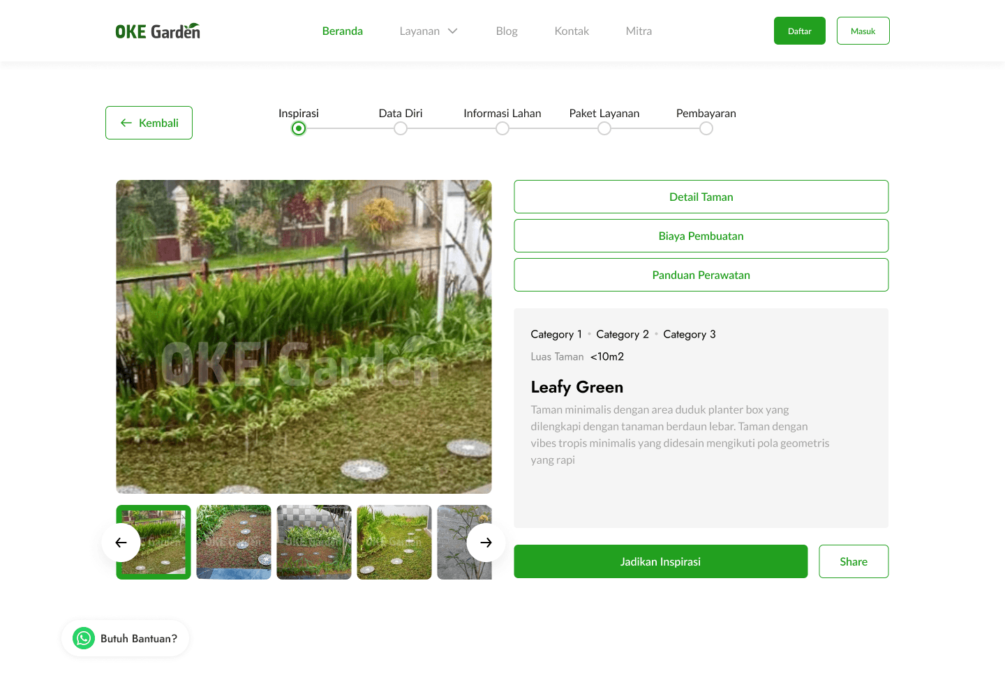 The design here is created as a road with each point to make it easier to understand for users to follow the journey. The illustration here uses a green scheme that matches the OKE Garden brand. For the page itself, we designed it in Indonesian, with a layout like a form flow, so when users click on next, it will take them to a similar page that resembles a flow. There is also a floating WhatsApp button just in case users are confused and want to ask directly to the team via WhatsApp.