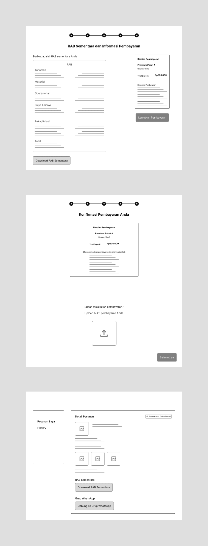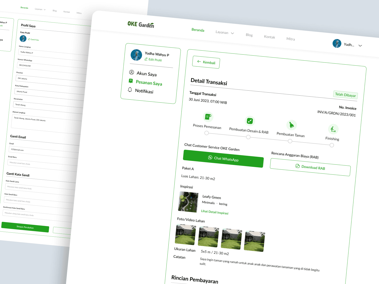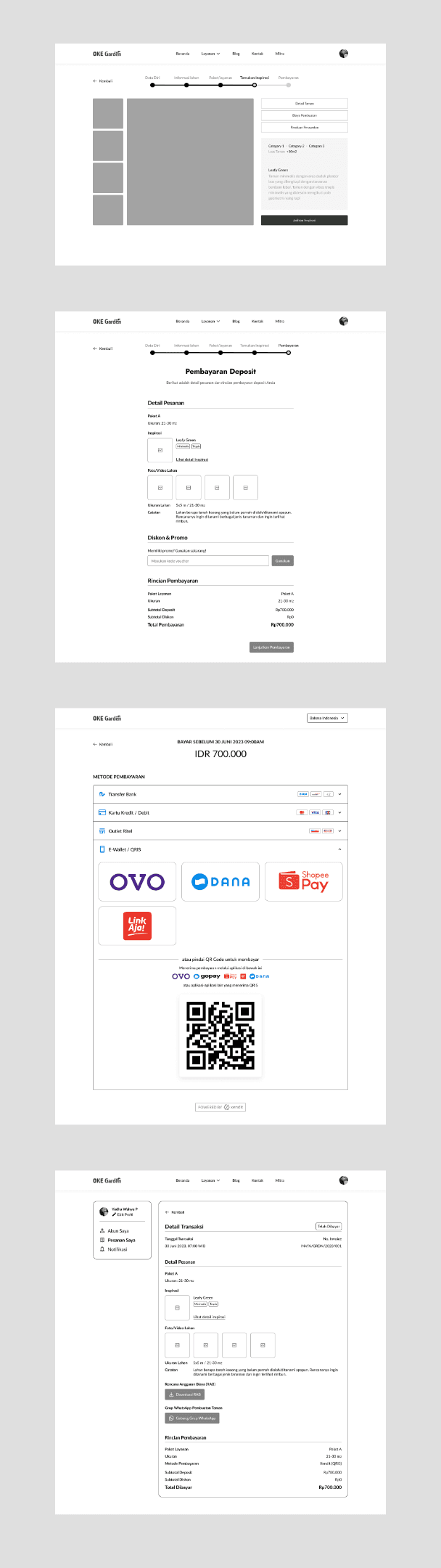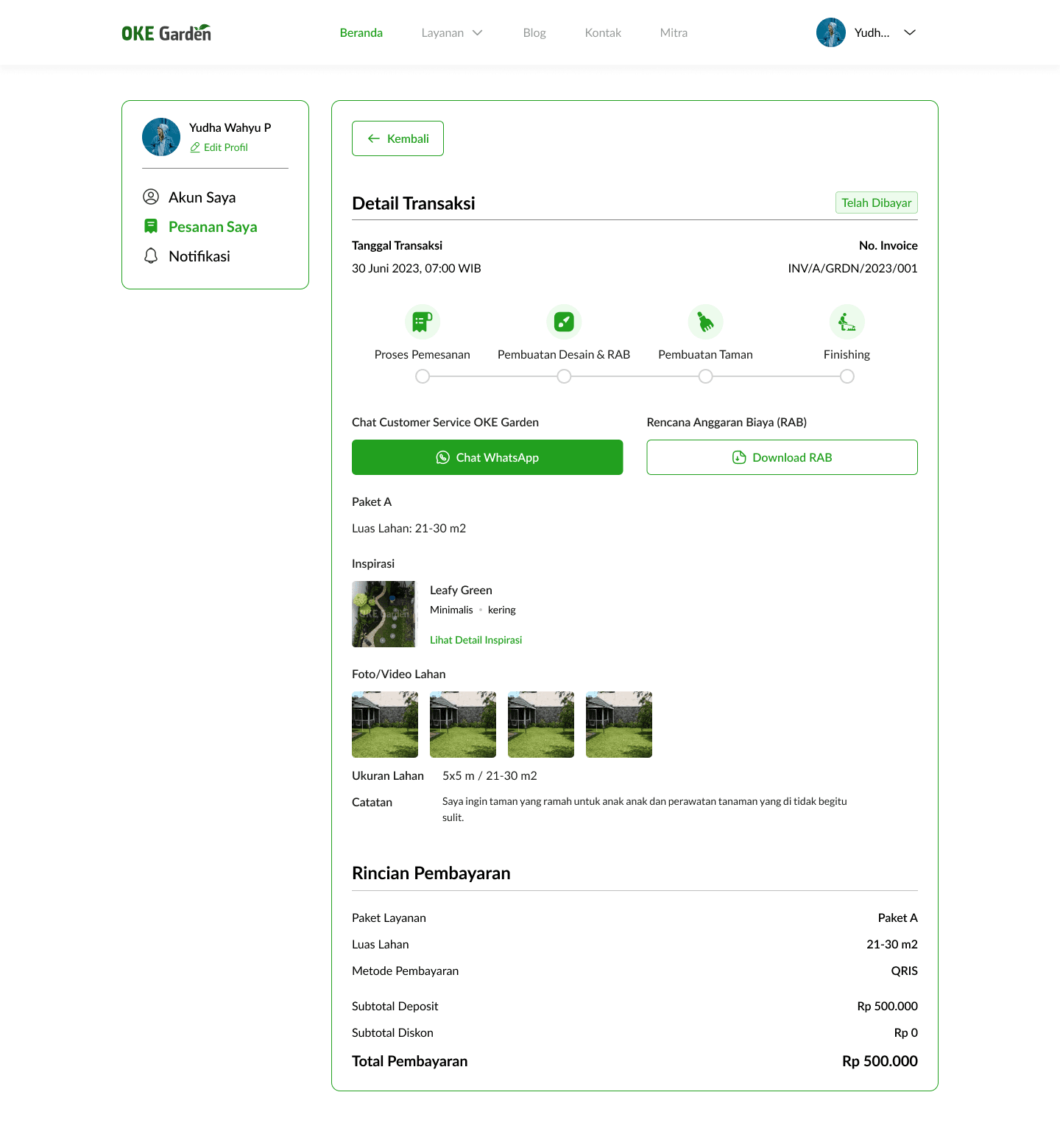 After completing the deposit payment, users will be taken to the customer dashboard page which shows their transaction details and what is the next step in their ordering process. Here is shown the current step in the ordering process along with an option to chat with customer service via WhatsApp and download their garden budget plan. This page will be updated regularly when each step has passed and when everything is done, users can see their garden design and choose whether to continue to build the garden or not. If yes, the remaining process will still be done via WhatsApp group because it will involve various parties in the process. If not, they will have an option to get back their deposit fee. Hence, this step is the end of the website ordering flow.