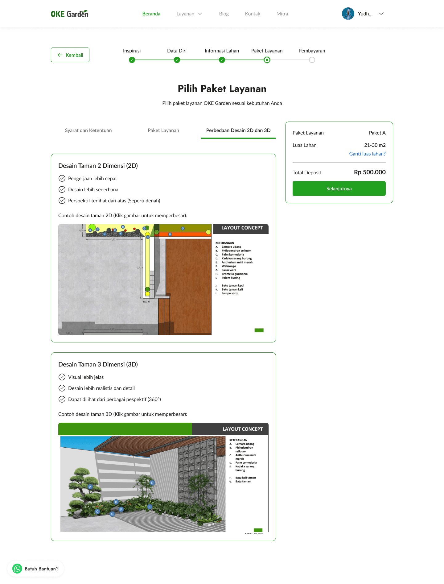 OKE Garden offer 3 service packages which have their features such as whether the design will be created in 2D or 3D and whether there will be a location survey or not. Every price shown here is the deposit price, meaning that after paying this, users will be proceeded depends on the package feature that they chose, and after it’s complete, they have the option to continue to build the garden (not just the design) or cancel and take back their deposit money.