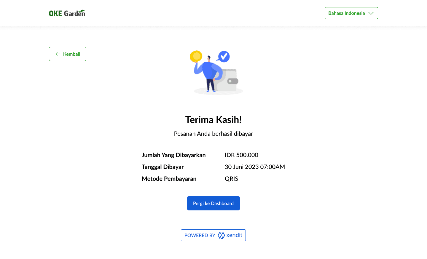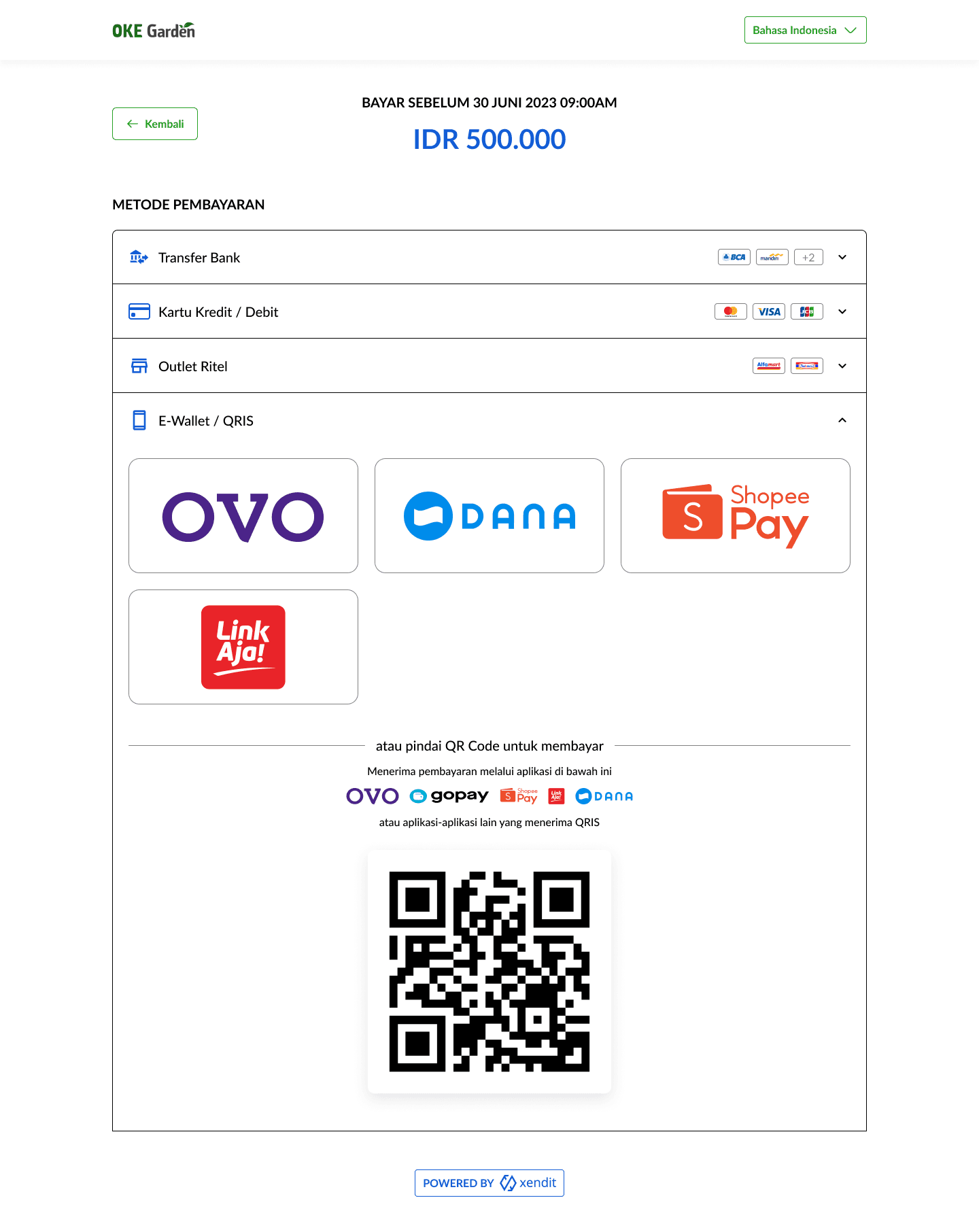 OKE Garden use Xendit as its payment gateway so the payment page will lead here and users can choose which method they will use to pay.