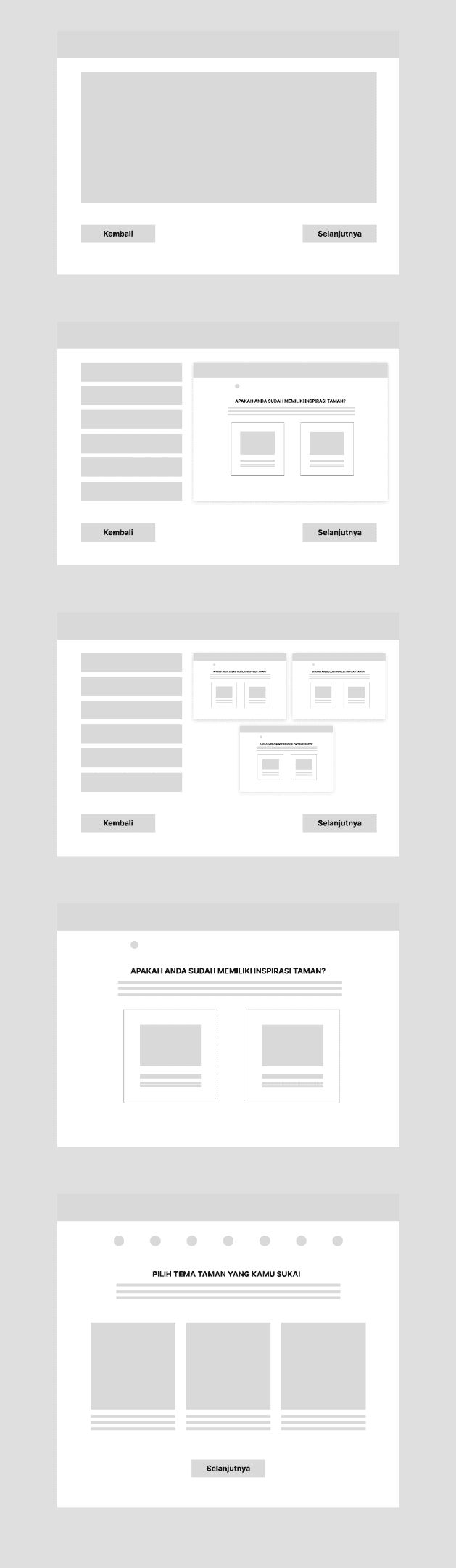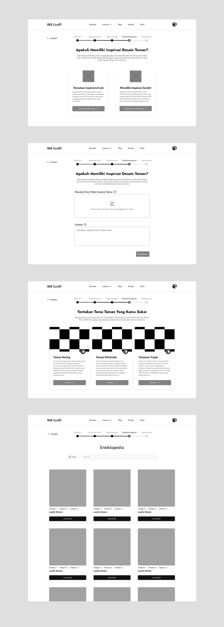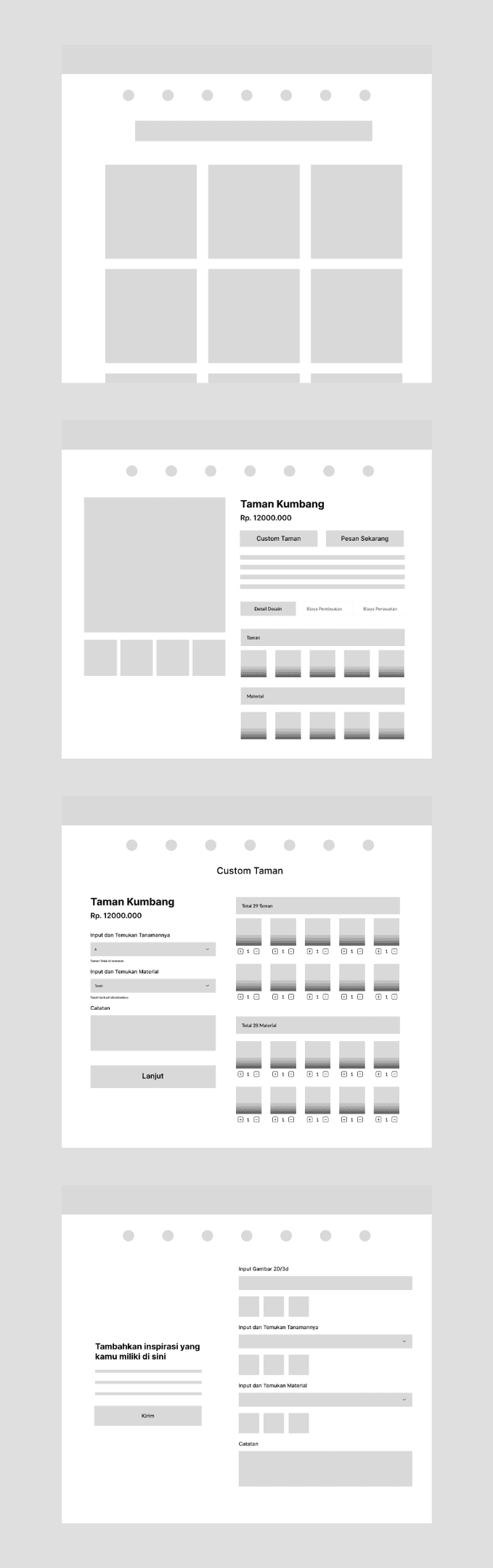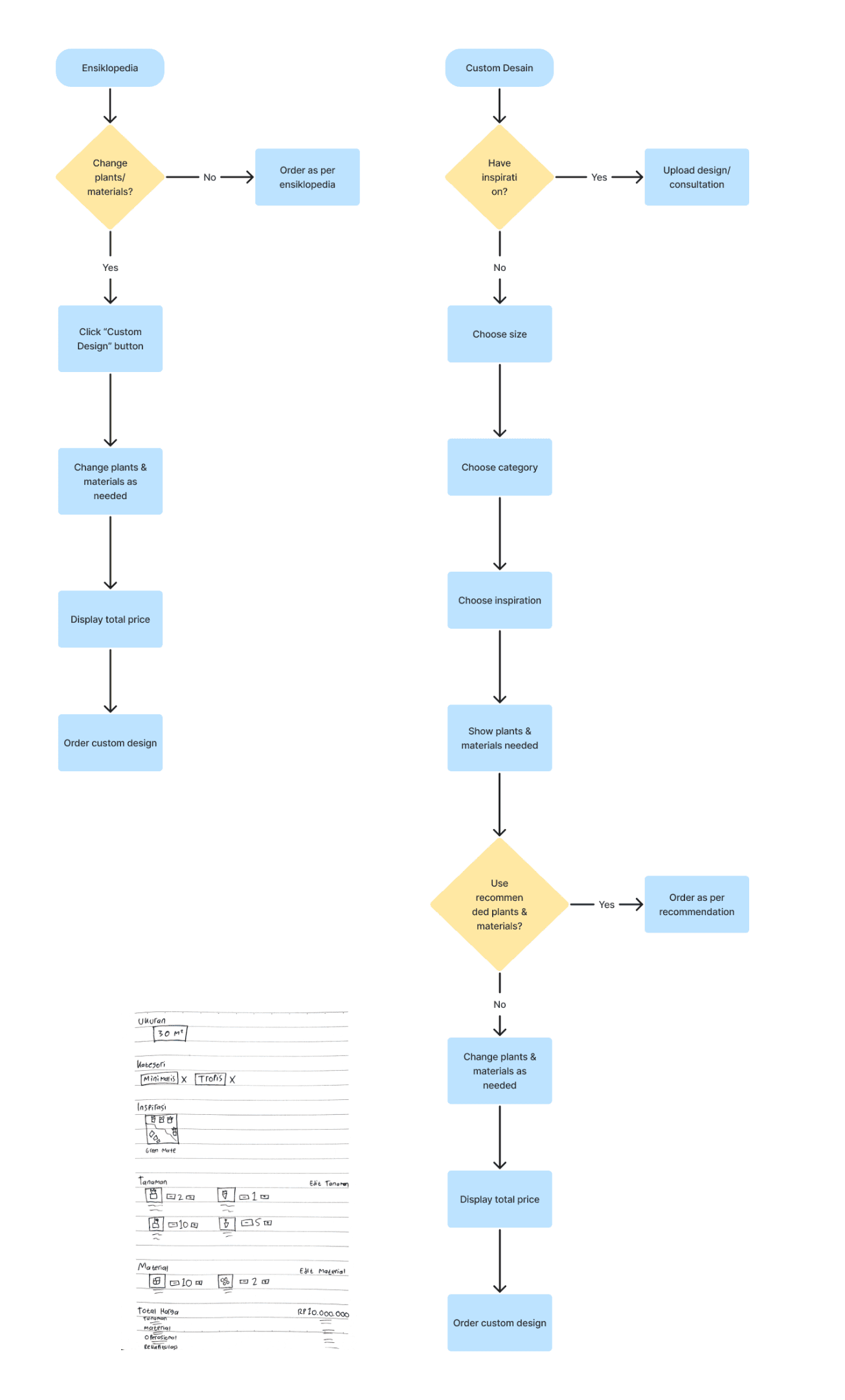 There are two flows here because it will have two places from where users can enter the new ordering flow; from the Ensiklopedia feature in which users can look through garden inspiration and proceed to build their garden from there, and one from the Custom Desain button from the home page. The difference is whether the users should look for the inspiration first or look later after entering the flow.