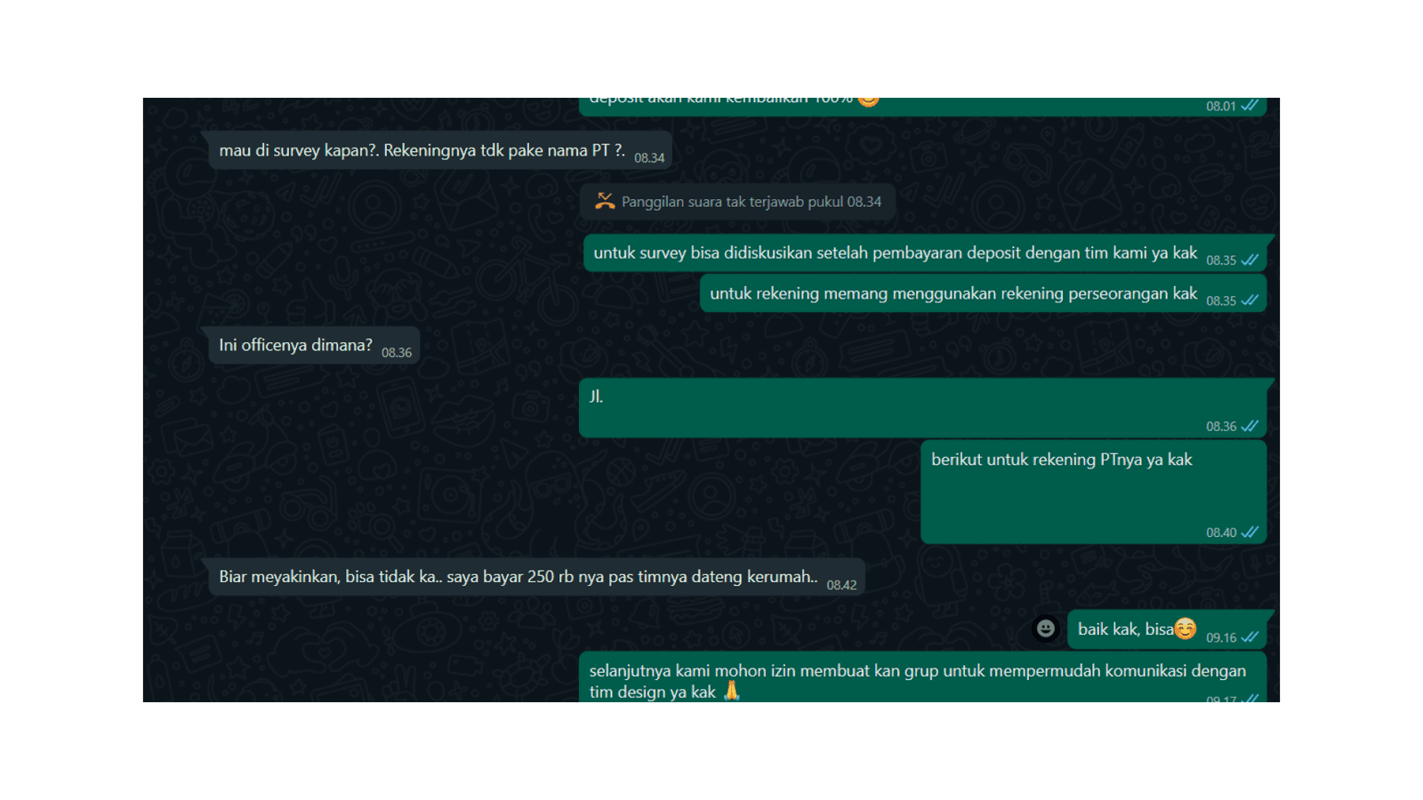 One of the issues that I noticed often is that the credibility of the company sometimes is questioned by users. In this example, the user doesn’t want to make a deposit payment directly because the account number provided is not on the company name but is still individual. Here the user also asks for the company address to make sure that the company is real and not a fraud.
