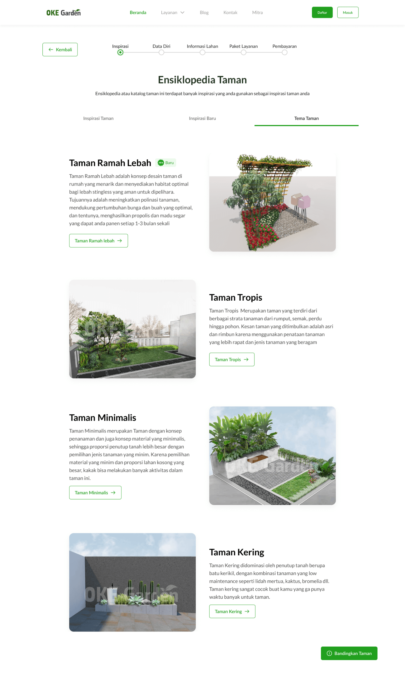 Another tab is a page that explains every garden theme available, such as bee-friendly garden, tropical garden, minimalist garden, and dry garden. Users can choose each theme and it will take them to the Ensiklopedia page which is filtered based on their theme choice. There is also a feature to compare themes, so when users are confused about what to choose, they can have some information regarding the advantages and disadvantages of each theme.