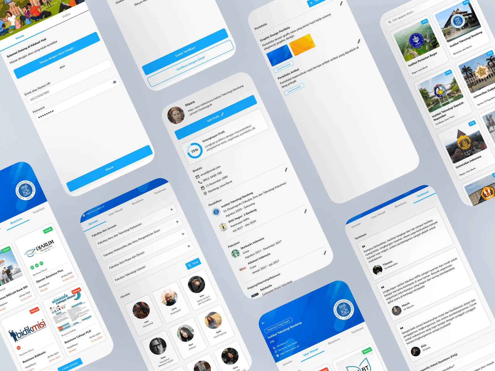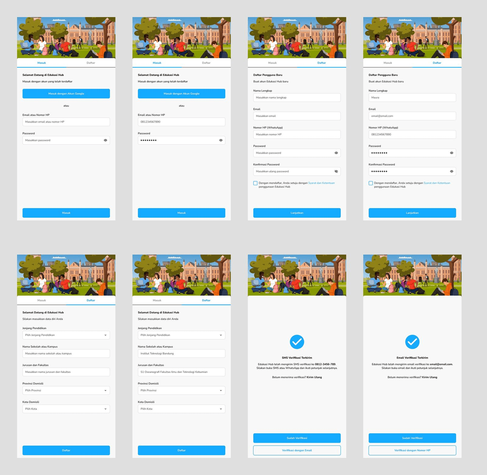 The login & register flow consists of a basic login page with illustration and input fields, then a tab to switch between login or register, and a flow to do email confirmation. I use relevant illustrations in the theme of university education since that is what this product is about. I also use the primary colour which is light blue across various design elements.