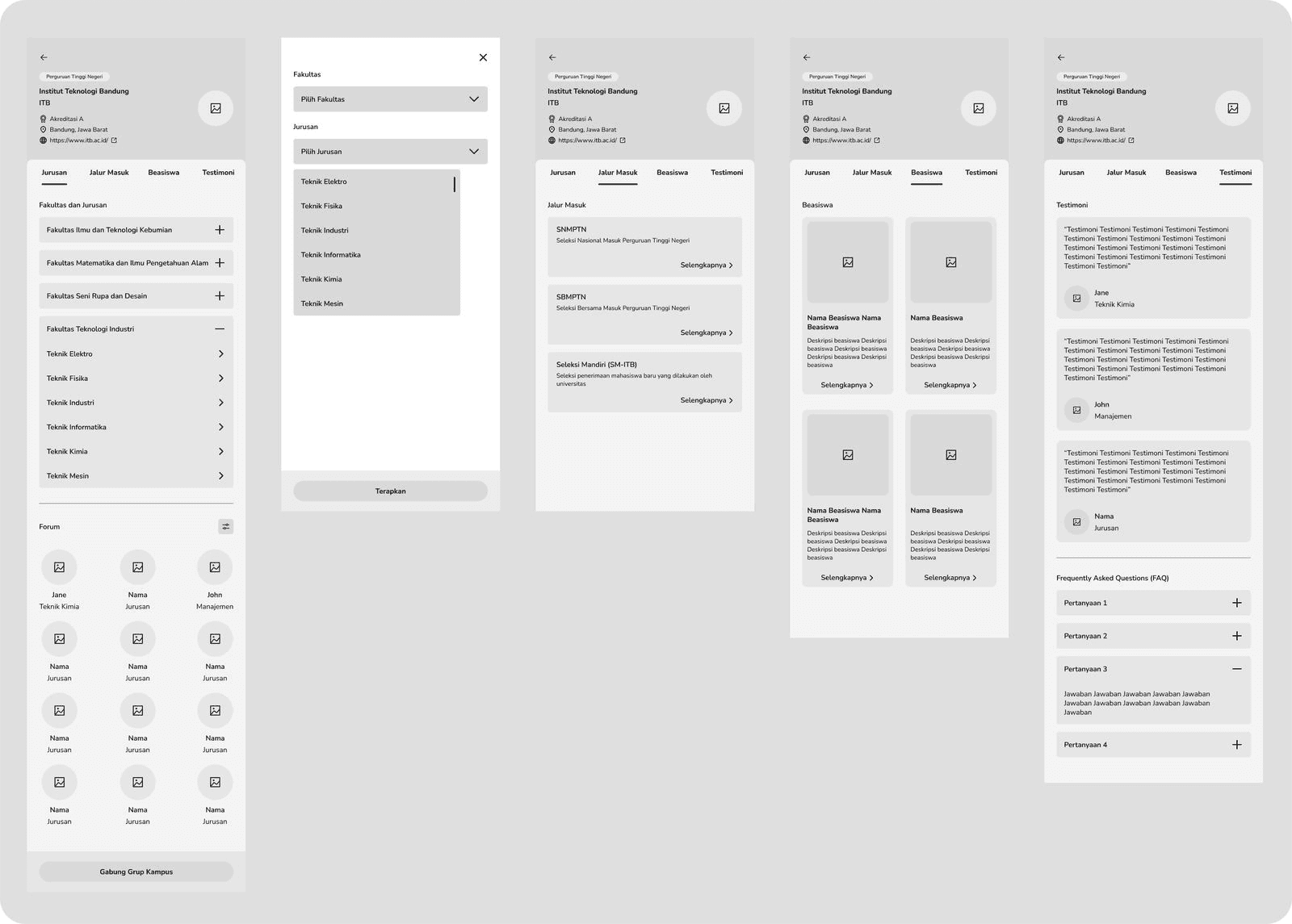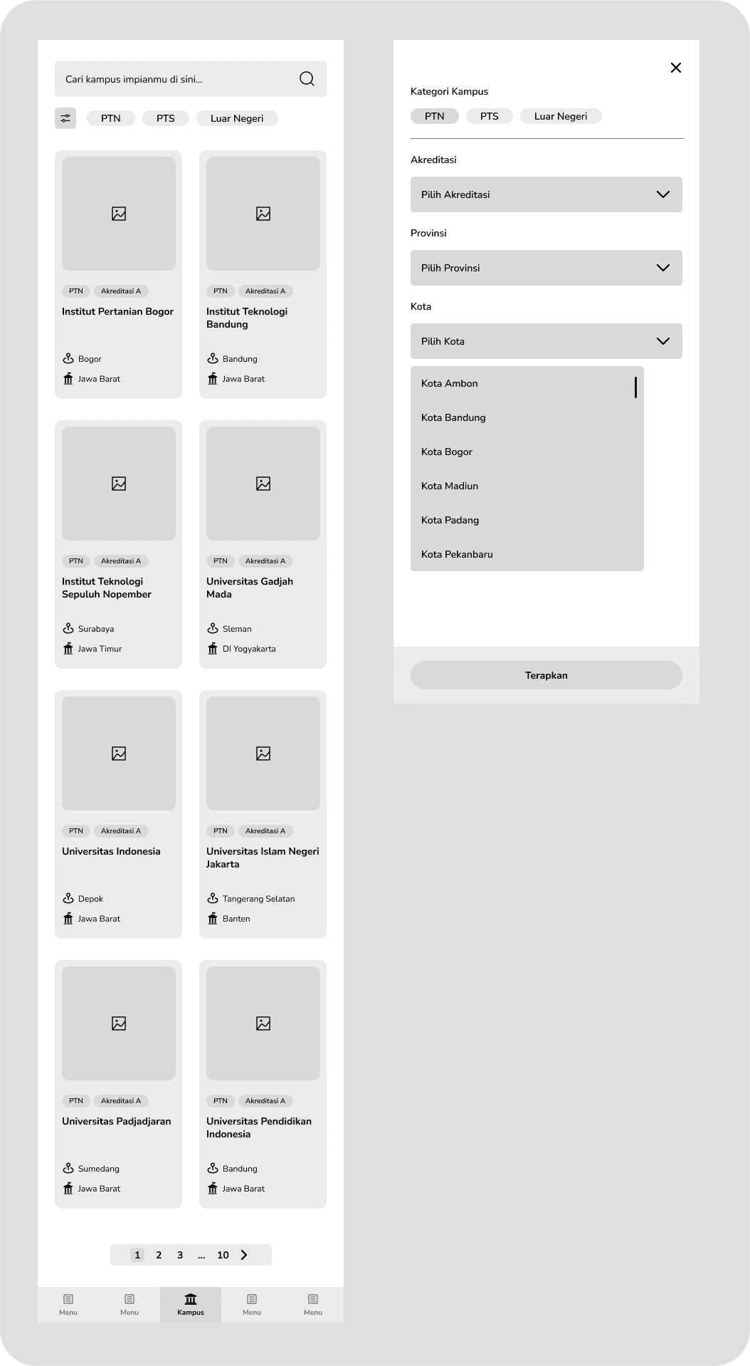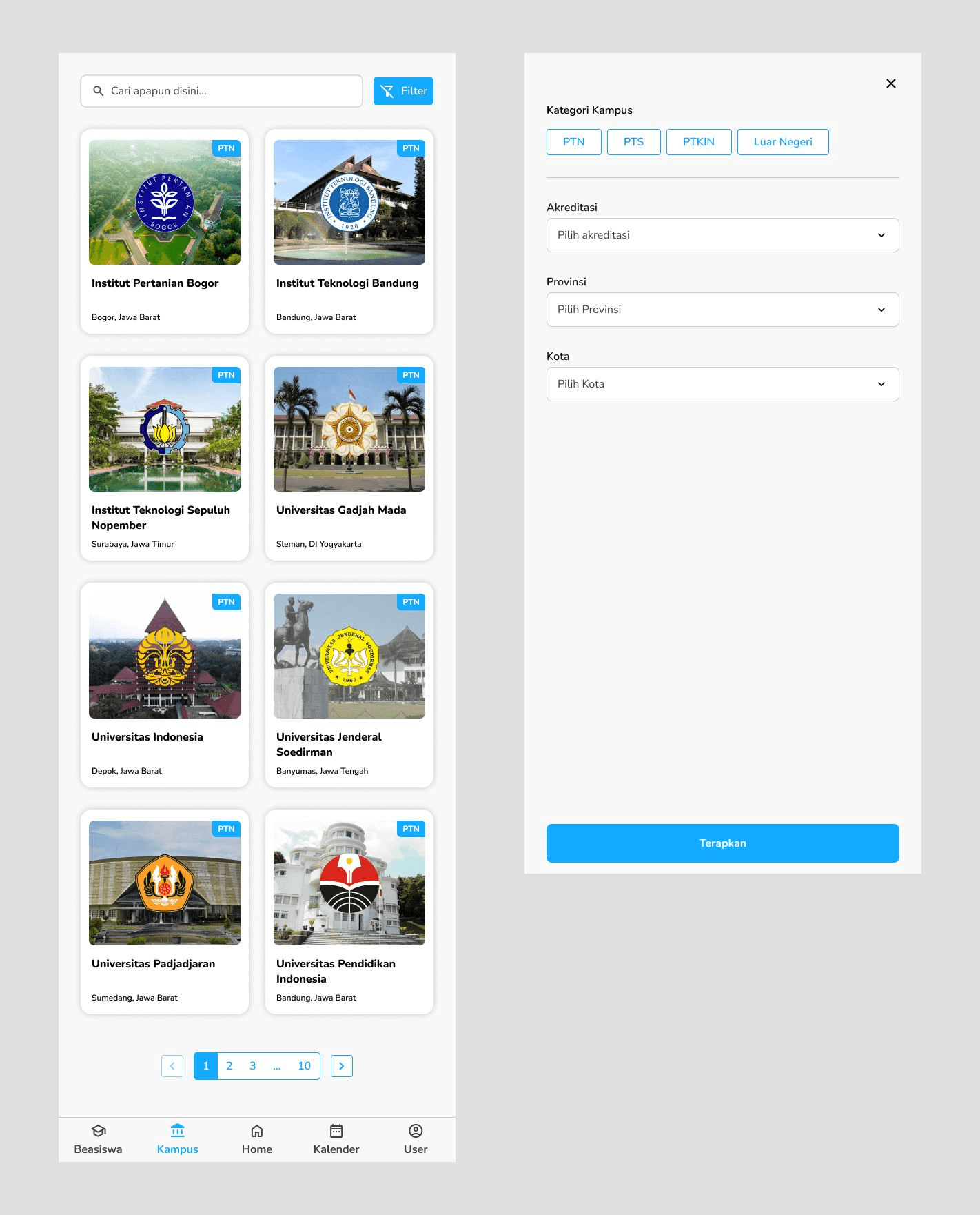 This is a page, which has the list of all campuses available especially in Indonesia. Here we have a search bar and a filter feature to filter campuses based on which is state or public or Islamic or abroad campus along with accreditation and location. The campus card was designed by my teammate and I made some adjustments to match the information needed to display. There is also a pagination and a navigation bar on the bottom side of the screen.