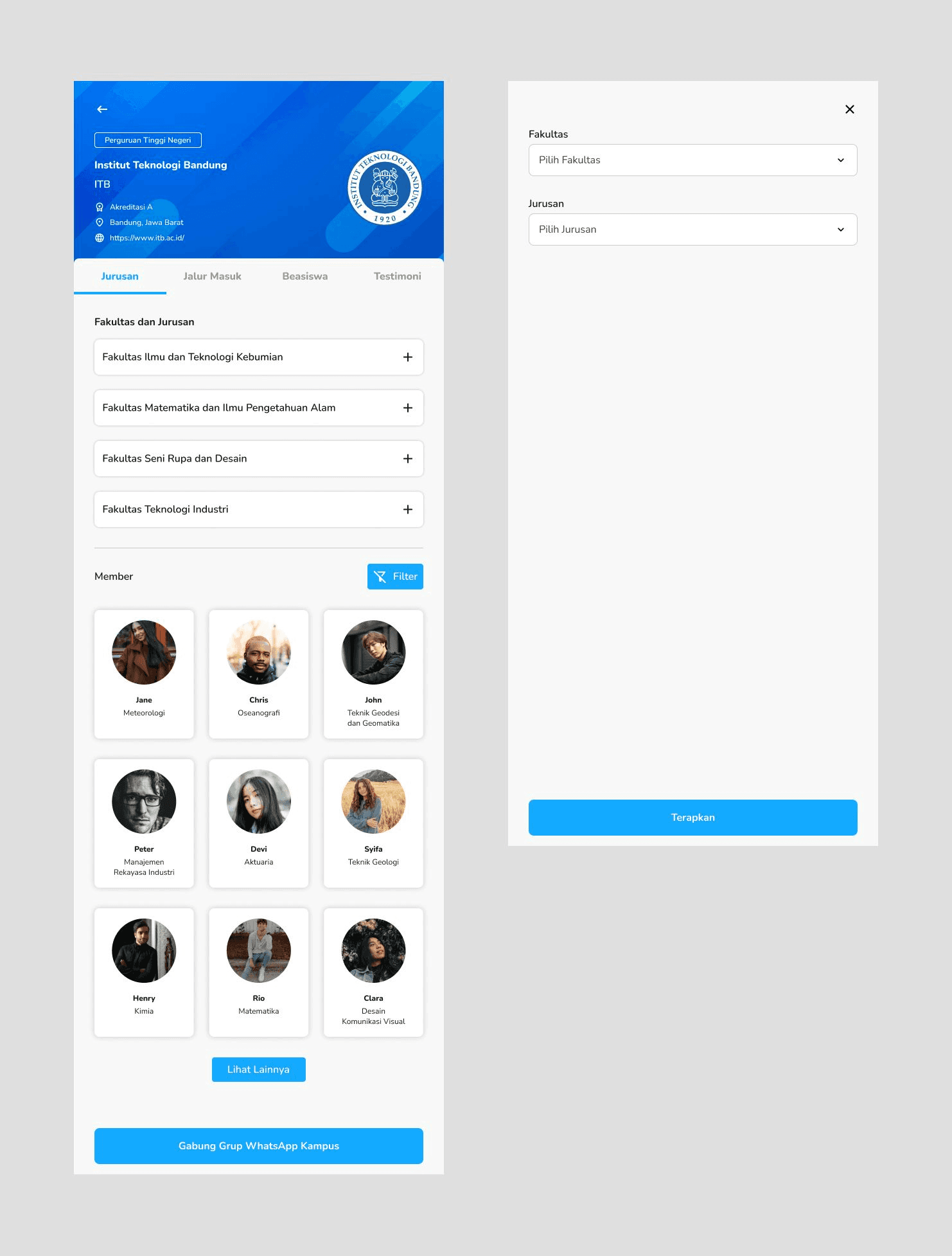 This is quite straightforward, there is the university logo with a background that matches its colour scheme. In the faculty and majors section, I created an accordion in which users can choose and click on their desired majors. In the members section, there is a filter option to filter the members according to faculty and majors. On the bottom side of the screen, there is a button that directs users to join the campus WhatsApp group with other Edukasi Hub members.