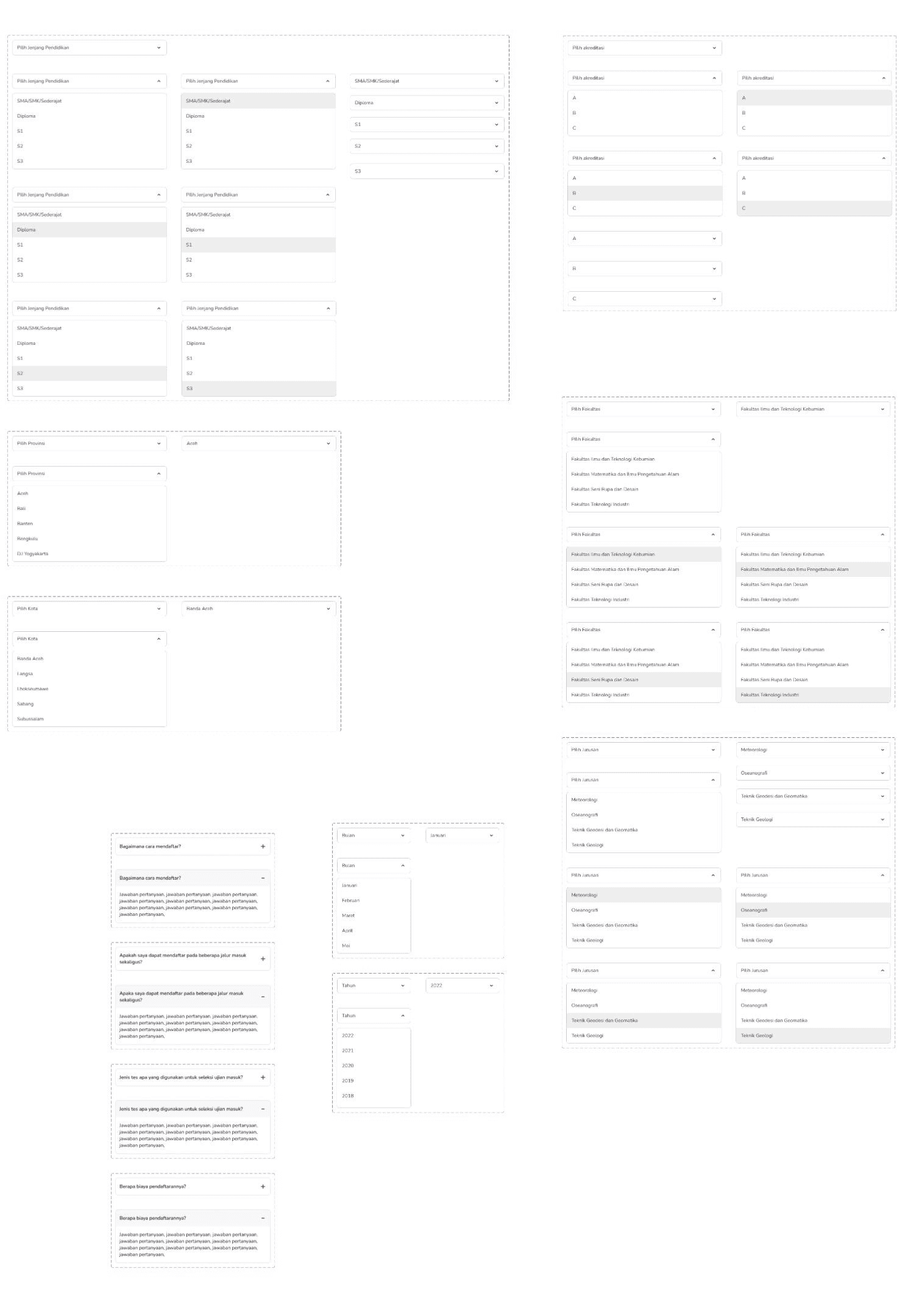 Even though I was experienced in creating components before, this is my first time designing components with interactive states like dropdowns and accordions. I learned a lot from my teammate and I created various versions of those components to provide my design needs.