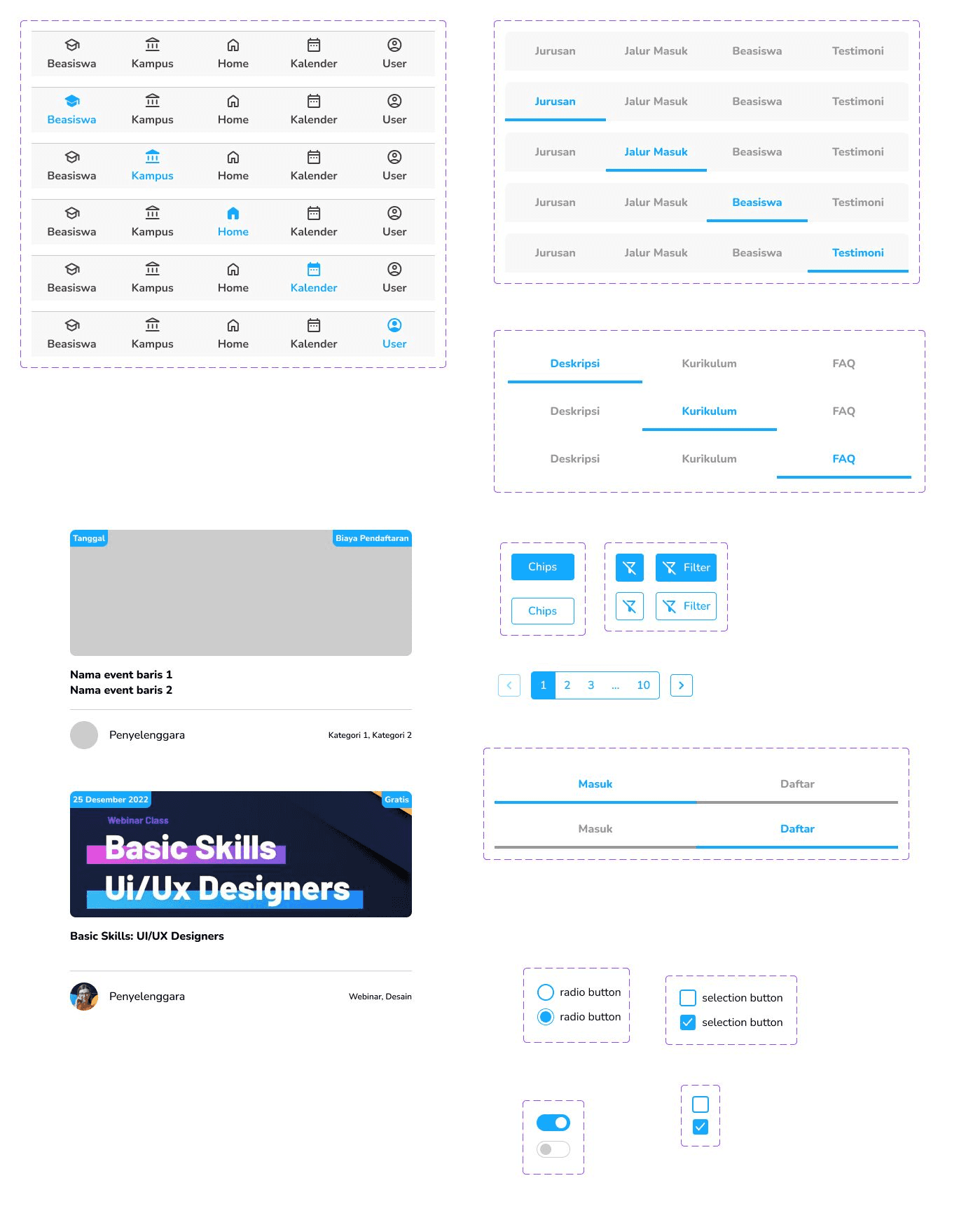 We need to create a design system before starting designing because we need all the design styles and components to be set up first so our design process can be easier. Our team split up the task and I was assigned to create some of these components such as a navigation bar, tabs, card for events, chips, filter button, pagination, radio, checkbox, toggle, and some accordions and dropdown for the feature that I worked on.