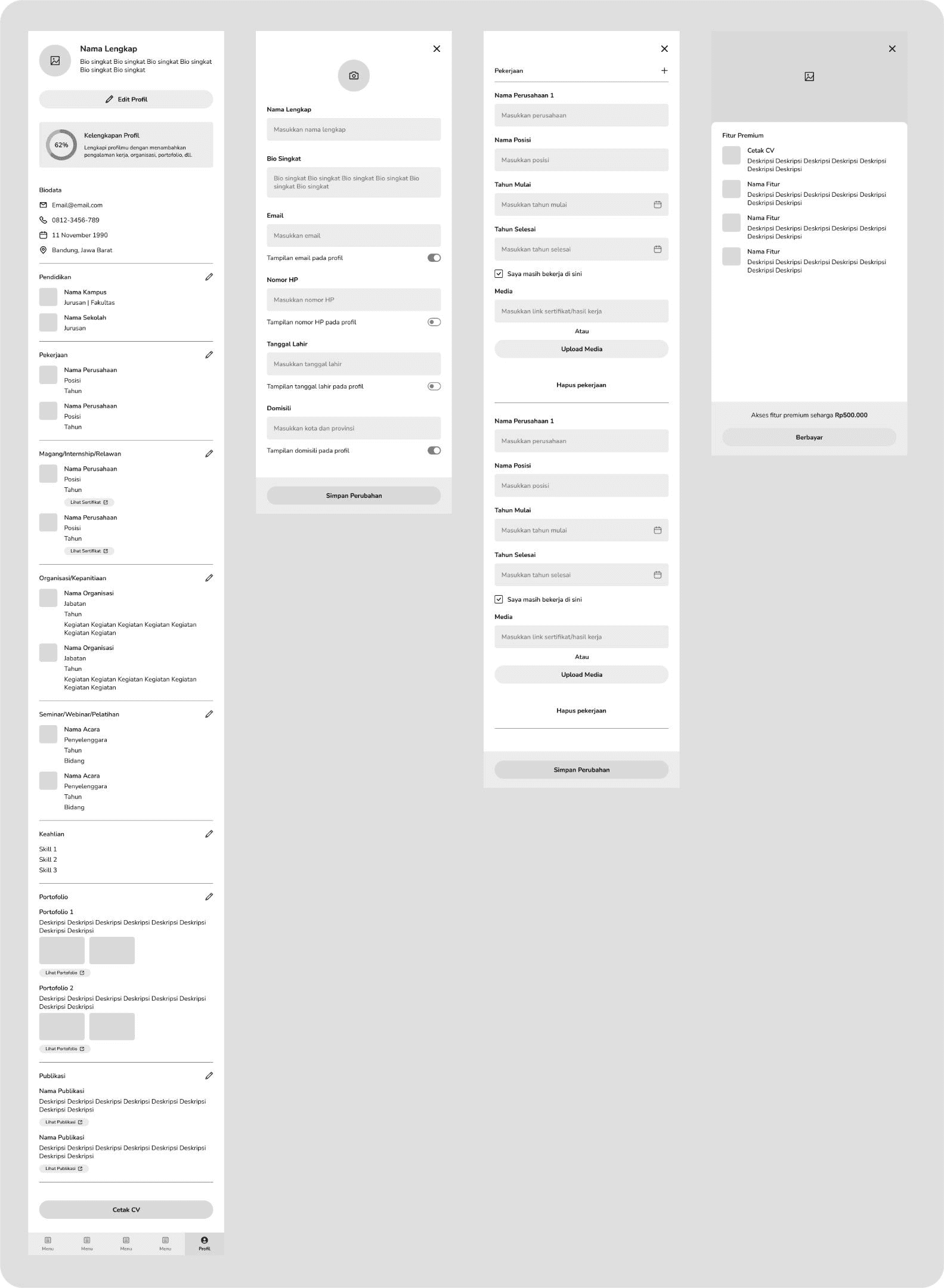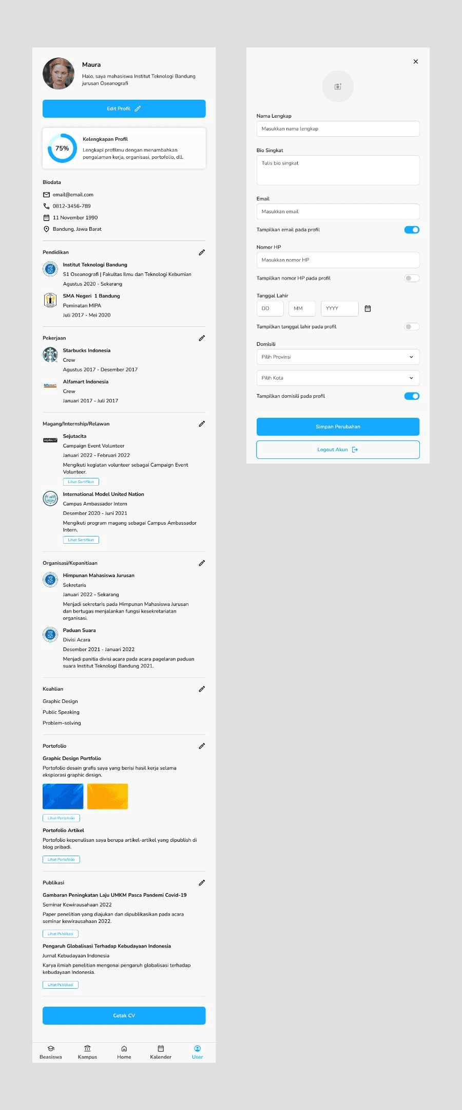 The profile feature contains users’ basic information, a button to edit their profile, profile data completion, biodata, education experience, working experience, internship/volunteer experience, organizational/committee experience, skills, portfolio, publications, and a button to print their information as a CV/resume.
