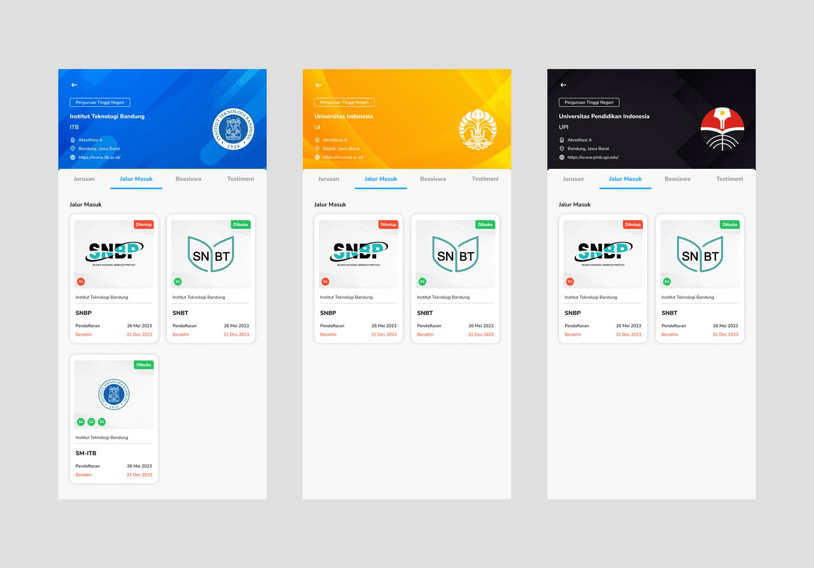 Since the header background should match the colour scheme of each university, here I create some variations for several top universities in Indonesia, each with their respective colour theme.