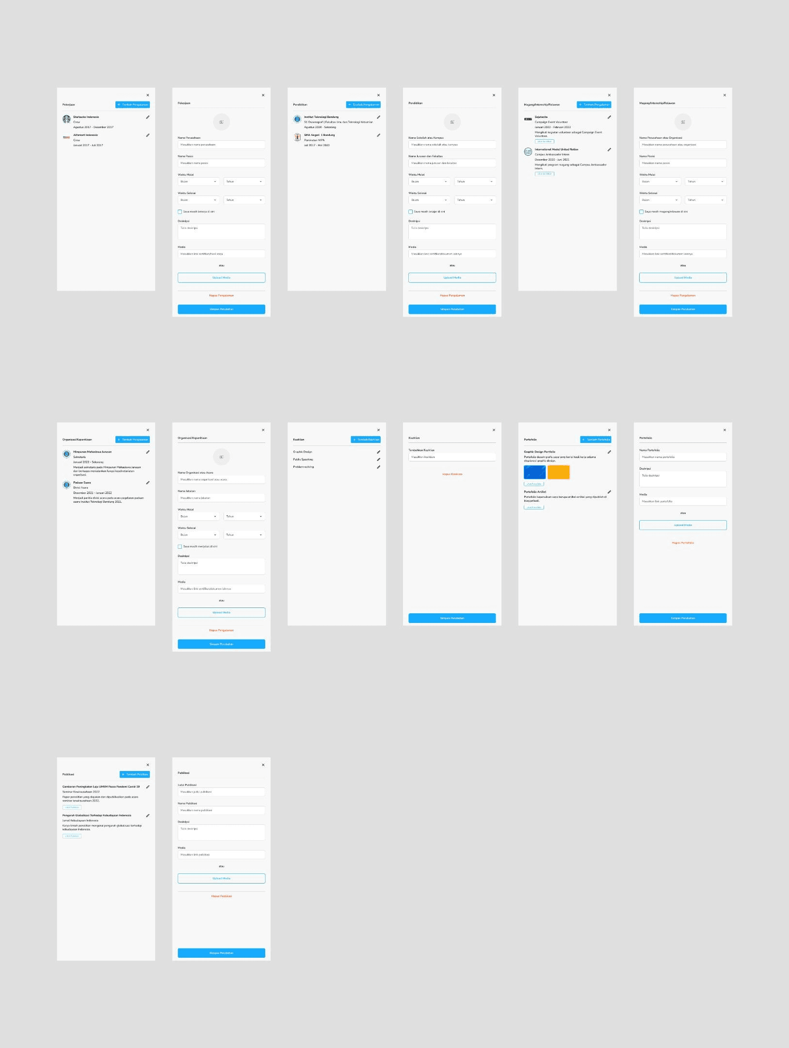 On each of the experience sections, users can add, edit, or delete any experience they want, thus making this profile page have a flow to add various users’ experience information.