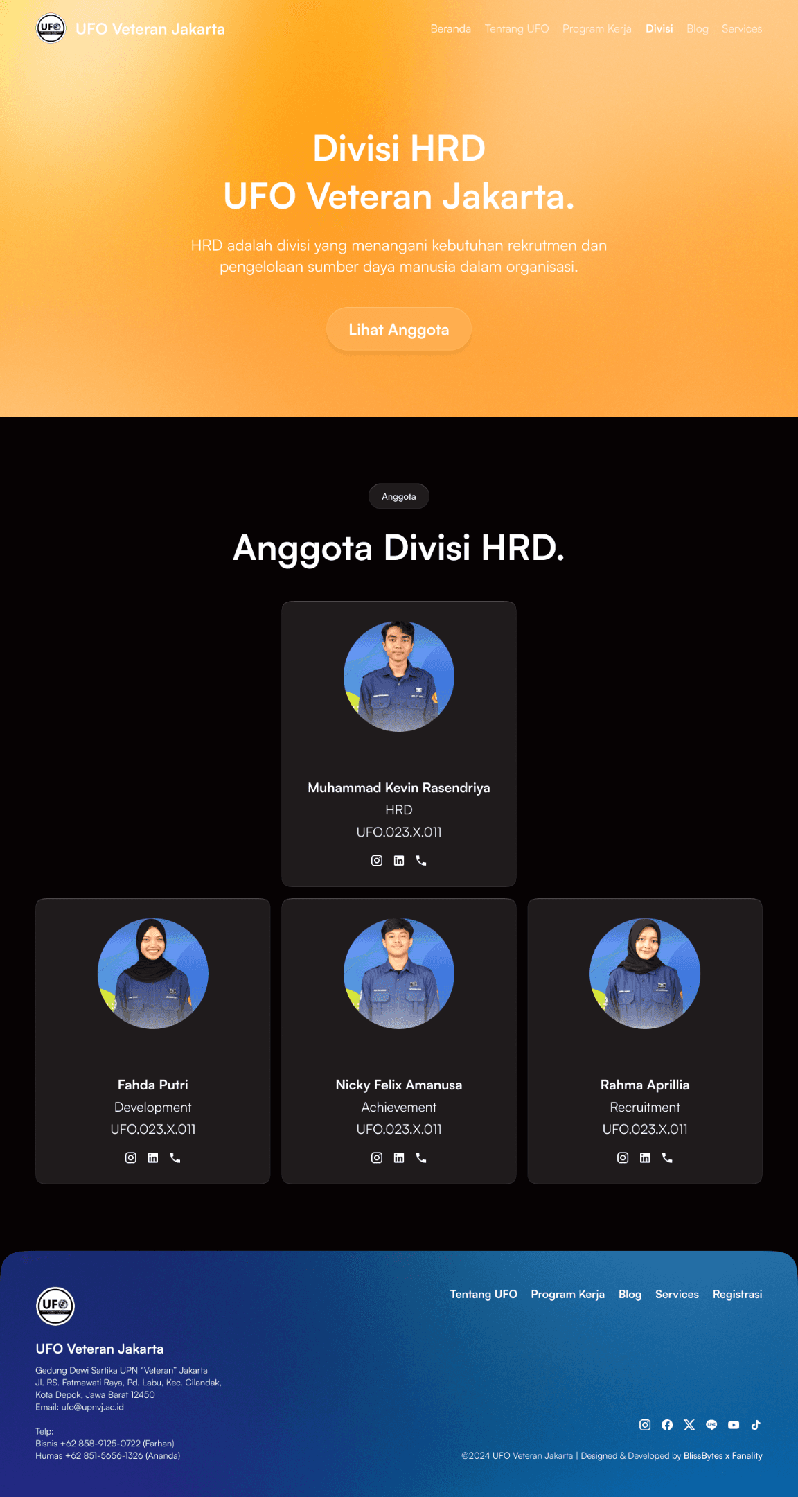 When a division card is clicked, it will direct users to a specific team page that shows all the members of the division. The design is similar to other sections with 3 cards on each row and since each division has its own leader then we designed the layout to match the organizational structure.