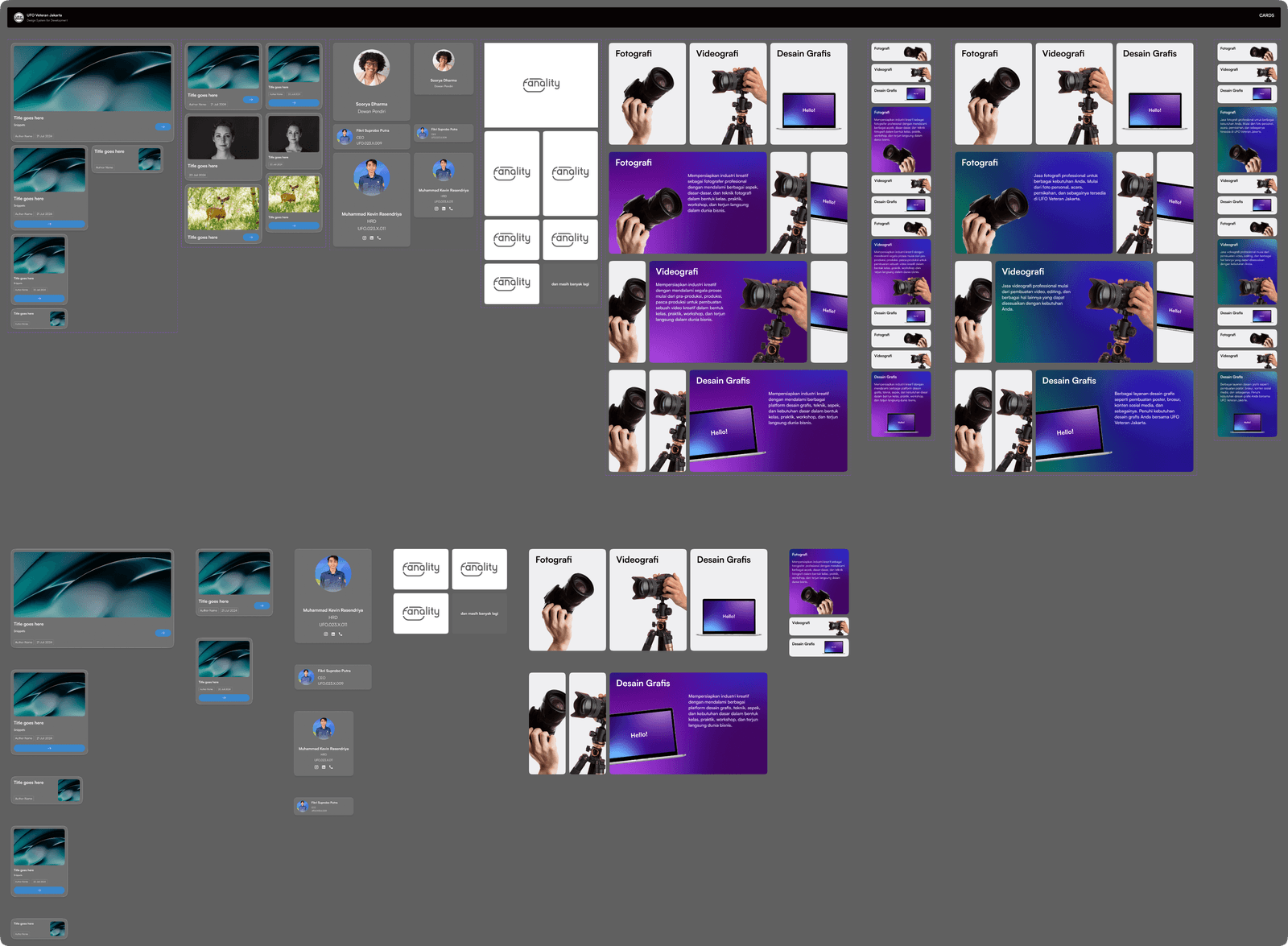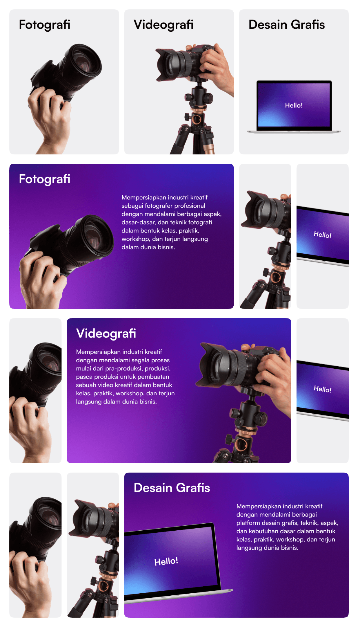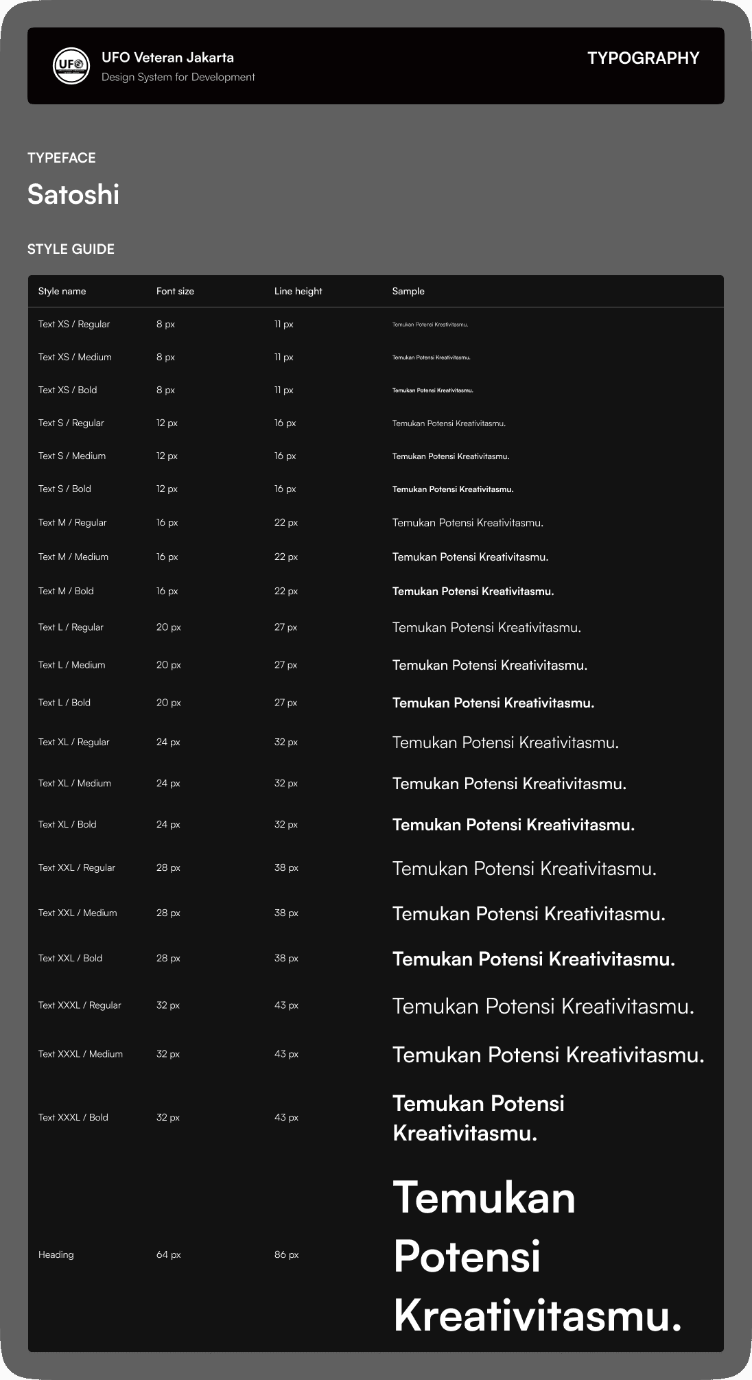 The typeface used is Satoshi because it’s quite a versatile typeface for any use including interface. We’re defining a style that all the headings will need to add a dot (.) at the end of the sentence. For example: Temukan Potensi Kreativitasmu(.). This was meant to give more uniqueness to the design style so that not just the colours and other design components can give a special feel, but also the typing style.