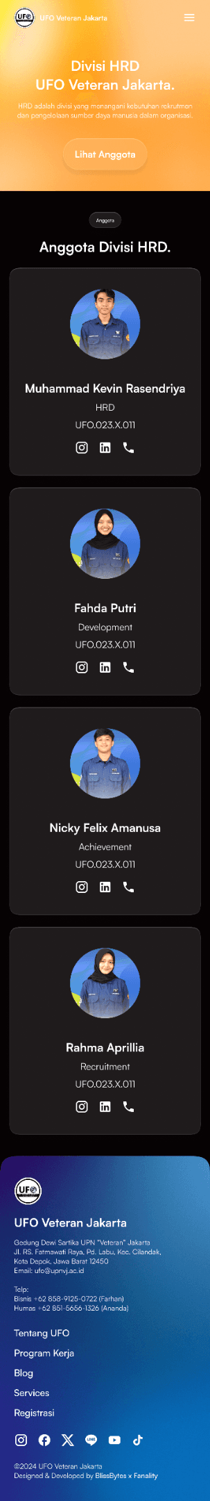 As the page that explains all the information about the organization, this page contains many sections and a variety of contents. The design style itself is matched with the home page which uses a mesh gradient background on the home page and some sections, and a glassmorphism style on cards. The gradients themselves are using various colours but they can match together to build fresh, colourful, and engaging feels.